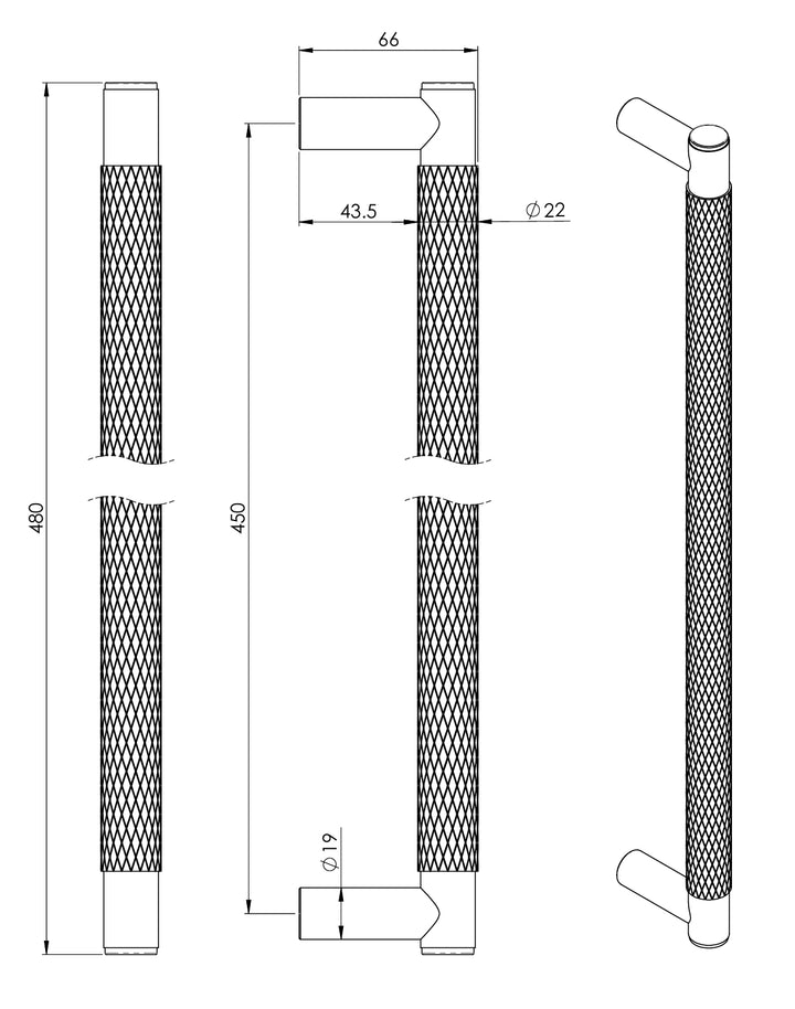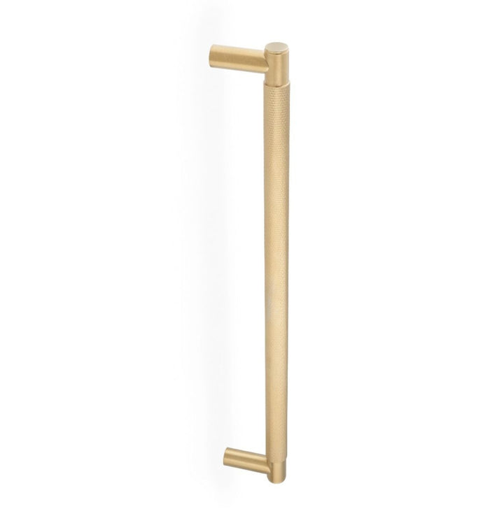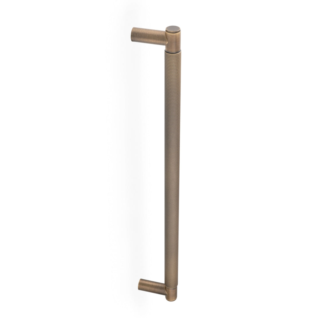 A single Alexander and Wilks spitfire 500 diamond cut knurled solid brass pull handle with stylish reeded texture set against a T-bar cylindrical stem silhouette. Supplied with bolt through fixings.