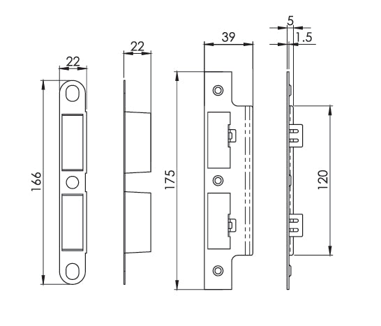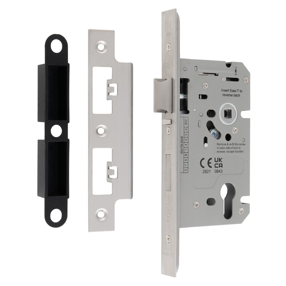 Heavy duty DIN European mortice strongly sprung europrofile cylinder escape lock case with two-piece 24mm wide square forend and anti-rattle striking plate (with black boxed keeps), with stainless steel reversible latch and deadbolt; suitable for domestic and commercial projects.