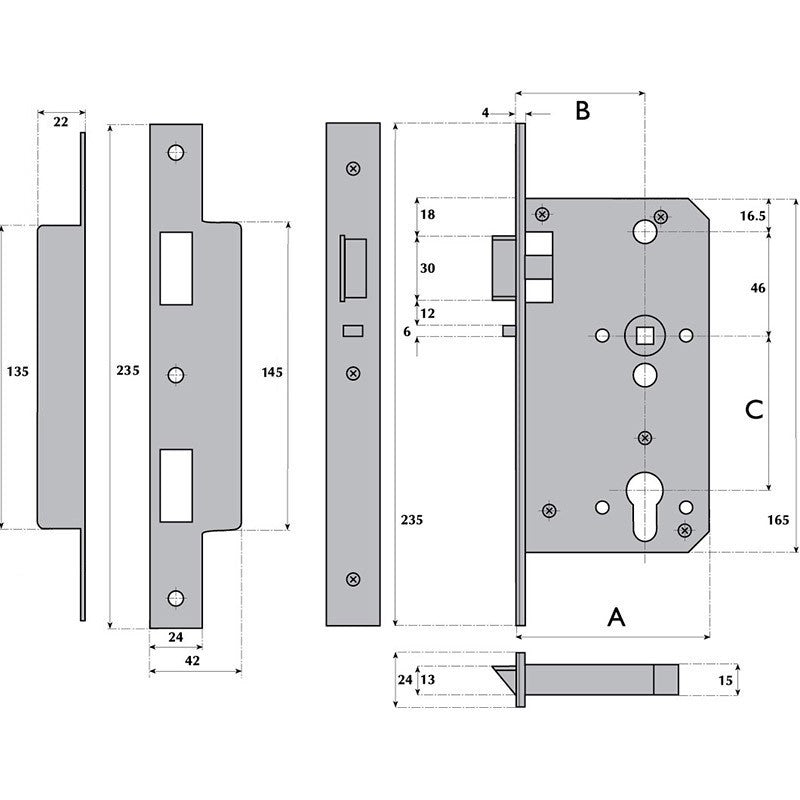Heavy duty DIN European mortice nightlatch case, where the latch bolt is operated by key from outside and lever handle or turn knob from inside using a single cylinder or by key from either side using a double cylinder or turn when using single cylinder and turn.