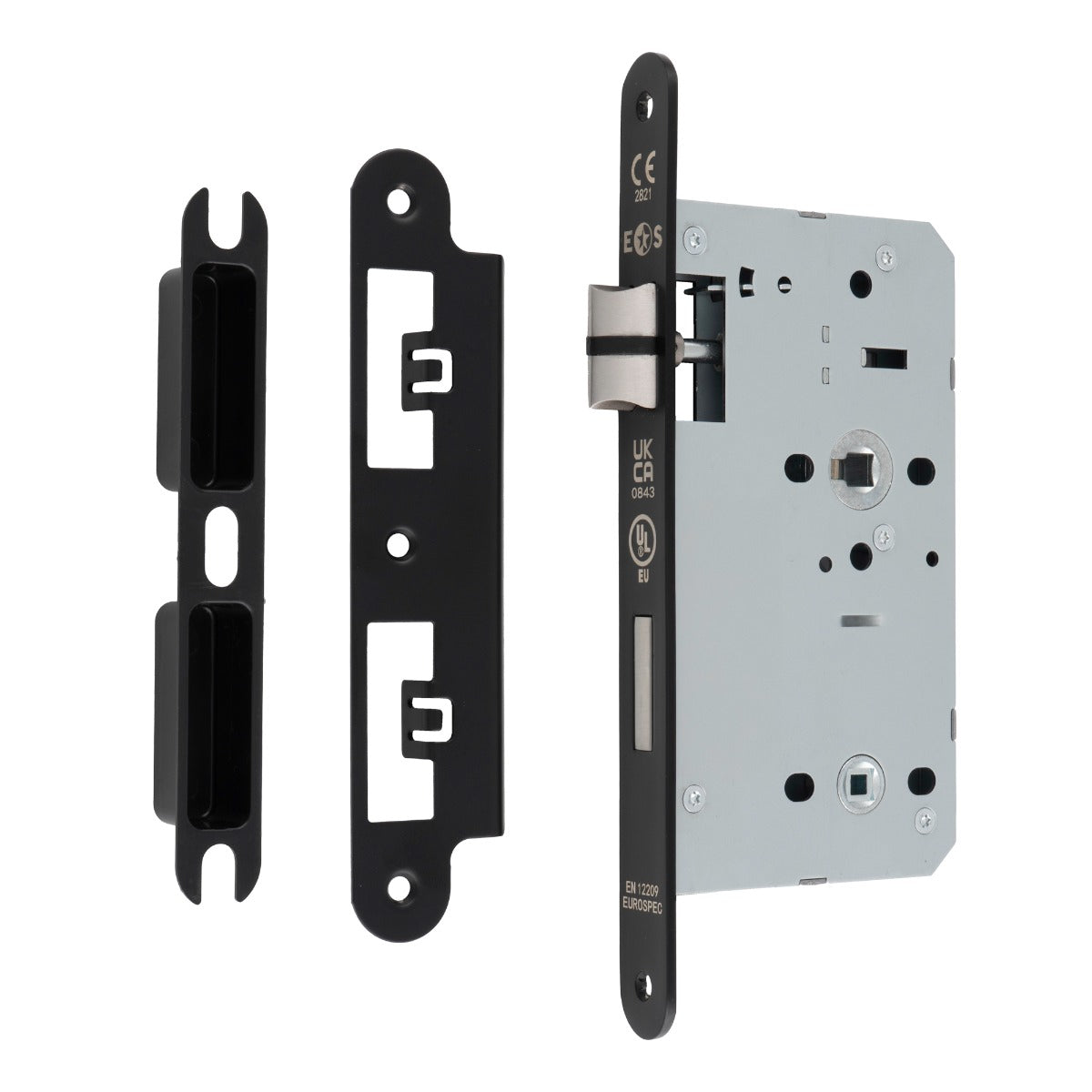 Heavy duty DIN European mortice strongly sprung (Grade X) bathroom lock case with 22mm wide radiused forend and anti-rattle striking plate (with black boxed keeps), with stainless steel silent ABS insert latch bolt and deadbolt; suitable for domestic and commercial projects. and deadbolt; suitable for domestic and commercial projects.