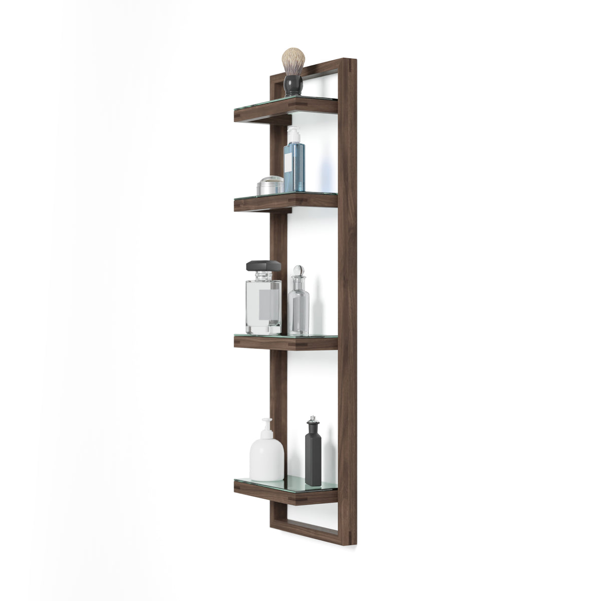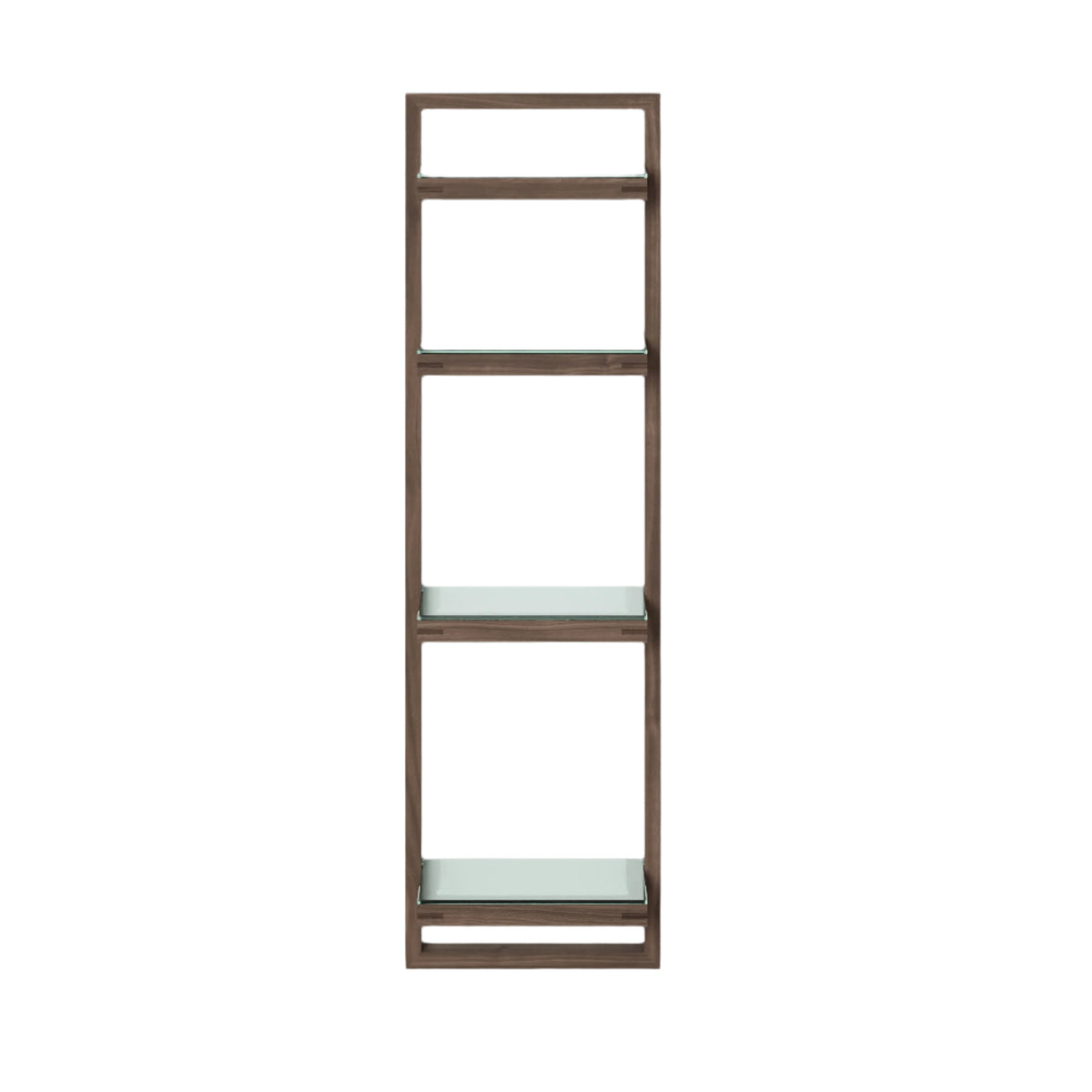 Zone wall shelf has four glass shelves. The glass sits proud on the frame supports making a feature of the polished edges. Shelf spacing is graduated to make it easy for storing both tall and short items. Adhesive silicone pads hold the shelves in place. The solid oak frame is assembled using fillet joints for strength and rigidity.