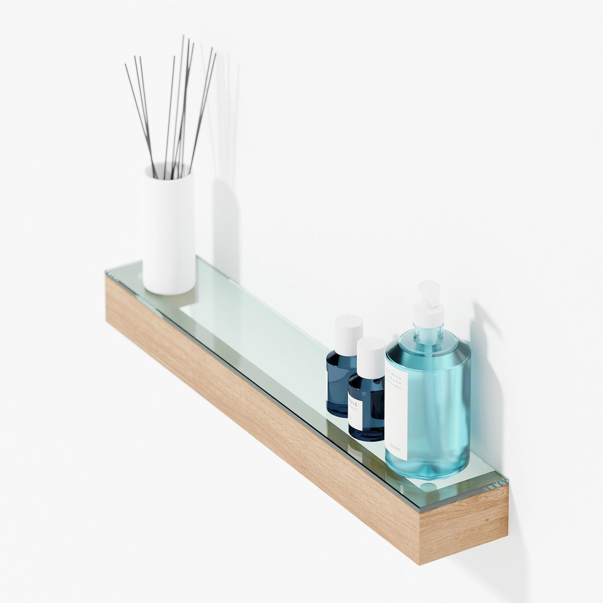 Wall shelf 'Slimline' combines the elegance of an emerald edged glass shelf with the natural beauty of oak. The glass shelf lies flush with the oak edge. No visible wall fixings give this design a refined minimalist look.