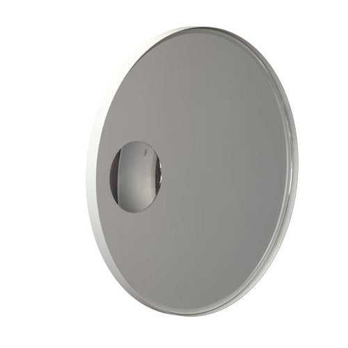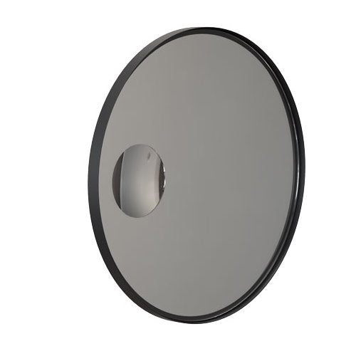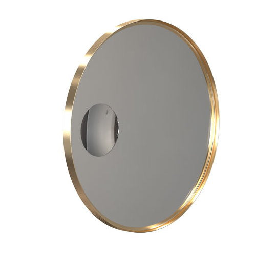 Frost Design UNU wall mounted 800mm diameter mirror with inset magnifier and 2mm frame. Available in PVD brushed Copper and Gold and aluminium black and white frame finishes, with black LED MDF backplate and transformer.