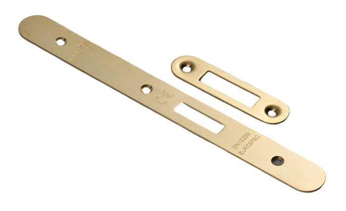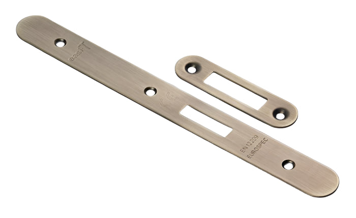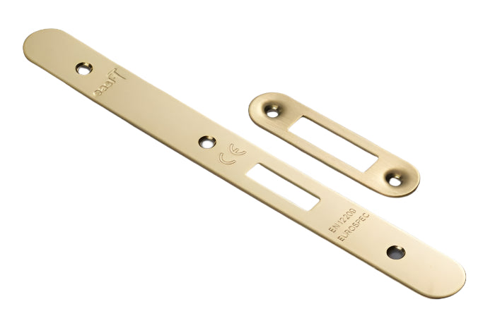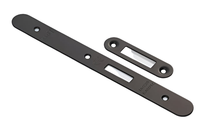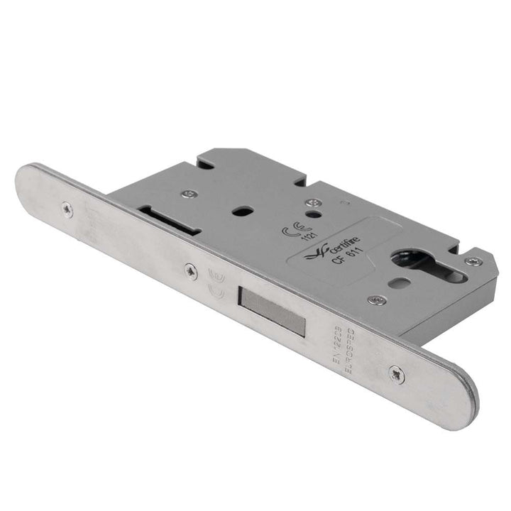 Heavy duty DIN European mortice europrofile cylinder deadlock case with two-piece 24mm wide radius forend and striking plate (with black boxed keep), with stainless steel deadbolt; suitable for domestic and commercial projects.