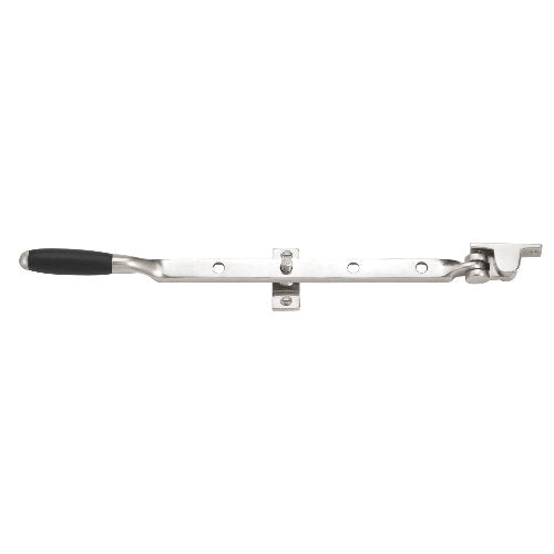 A solid stainless steel casement stay with two pins and slide guide channel.