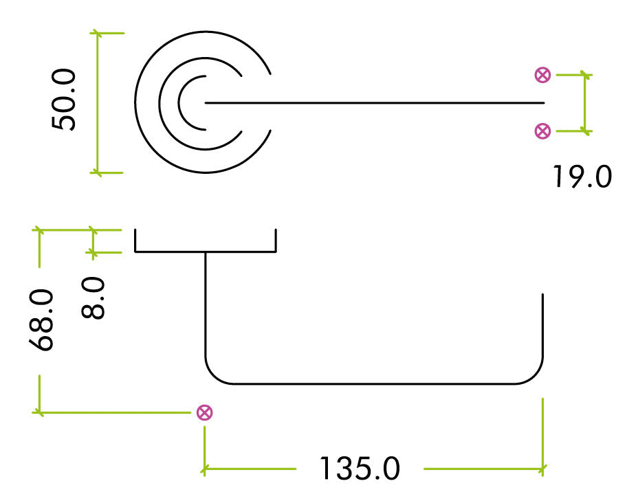 The Zoo Hardware Rosso Tecnica RT030 Maggiore 19mm diameter lever handle set with concealed fixing sprung roses, 8mm spindle bar, supplied complete with bolt through fixings to suit doors 35-54mm thick.