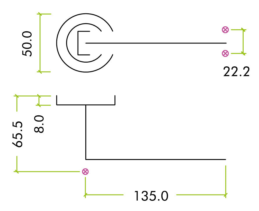 A set of two (pair) Zoo Hardware Rosso Tecnica RT050 Garda 22mm diameter "Walter Gropius" inspired mitred lever handle set with concealed fixing sprung roses, 8mm spindle bar, supplied complete with bolt through fixings.