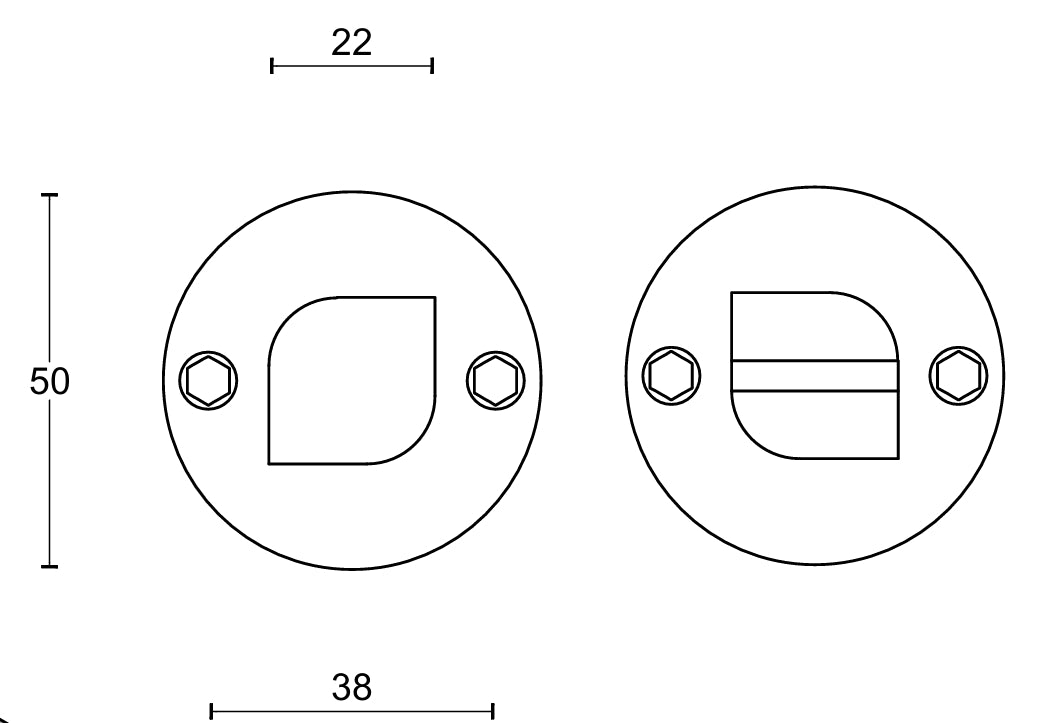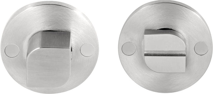 A satin stainless steel 50mm diameter x 5mm thick concealed fixing turn and coin emergency release set, without indicator, supplied with 5/6/7/8mm spindle bar to suit 44mm thick door.
