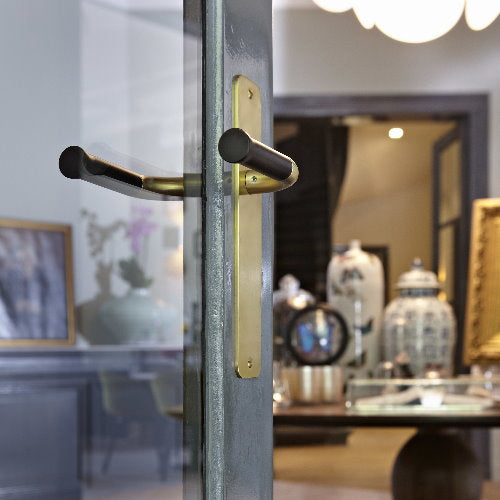 A set of two (pair) Nour solid stainless steel un-sprung lever handles attached to back plates, with visible fixings. Supplied complete with 8mm spindle bar, bolt through fixings and screws.