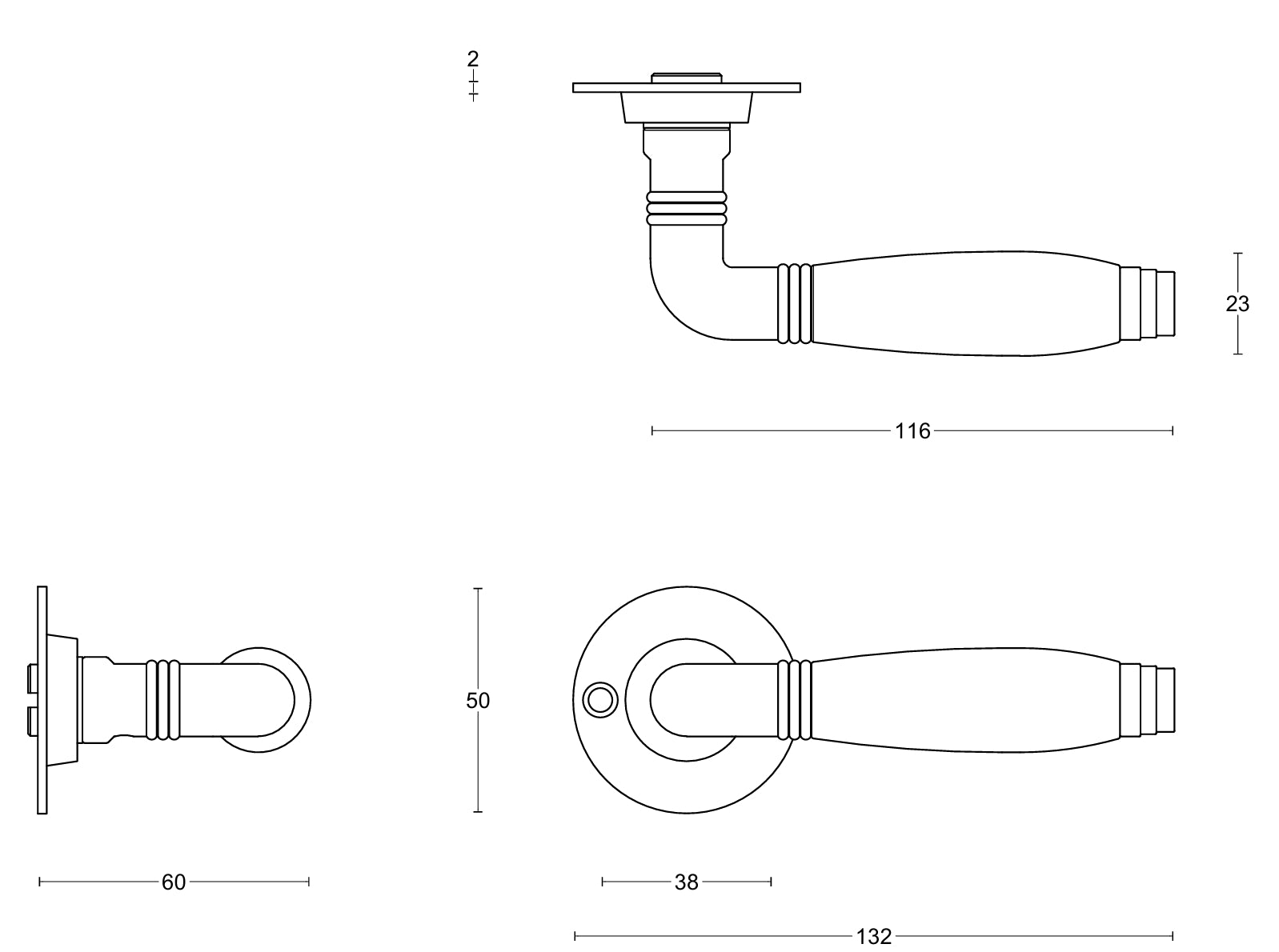 A set of two (pair) 1934 lever handles with sustainable ebony wood grip on visible fixing sprung roses, 8mm spindle bar, supplied complete with bolt through fixings and screws to suit doors 44mm thickness.