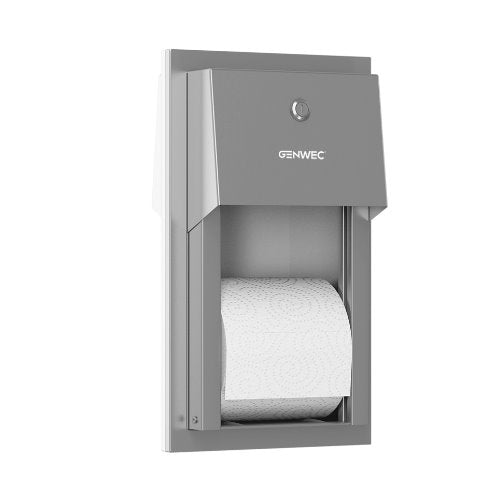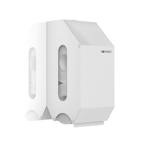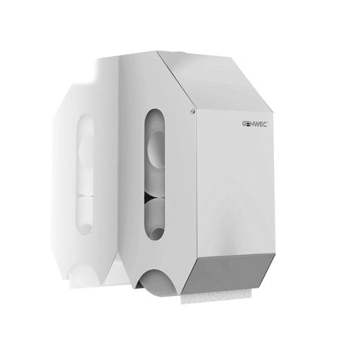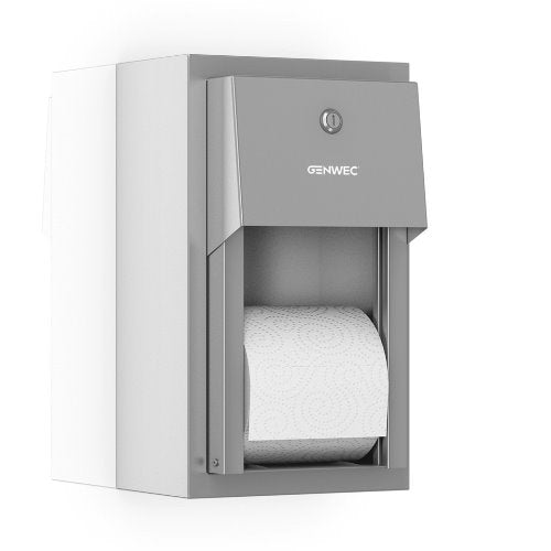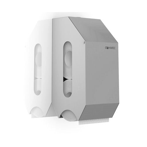 Genwec Double Roll Paper Dispenser made from grade 304 stainless steel with concealed wall-mounting fixings and upper lock key.