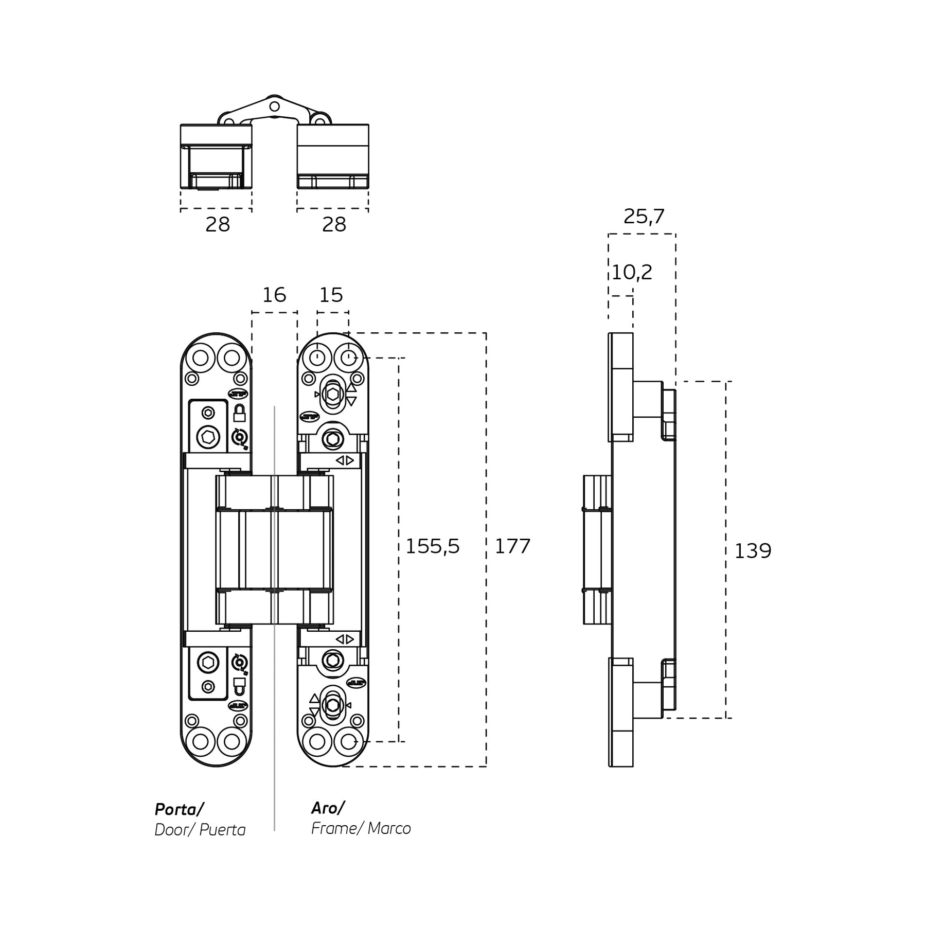 Suitable for timber, steel or aluminium frames with 3 dimensional adjustment (+/-2.5mm side and height and +/-1.5mm compression). 120 degree opening angle.