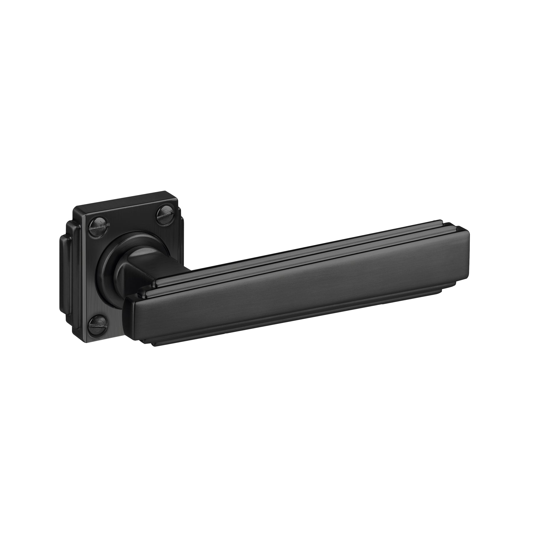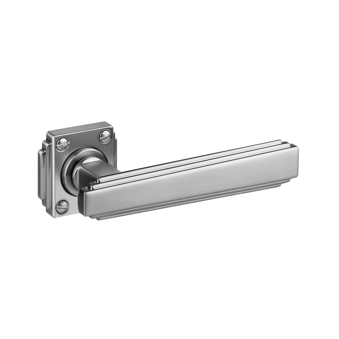 A set of two (pair) grade 304 stainless steel Art Deco door lever handles on square stepped visible fixing sprung roses, 8mm spindle bar, supplied complete with bolt through fixings and screws.