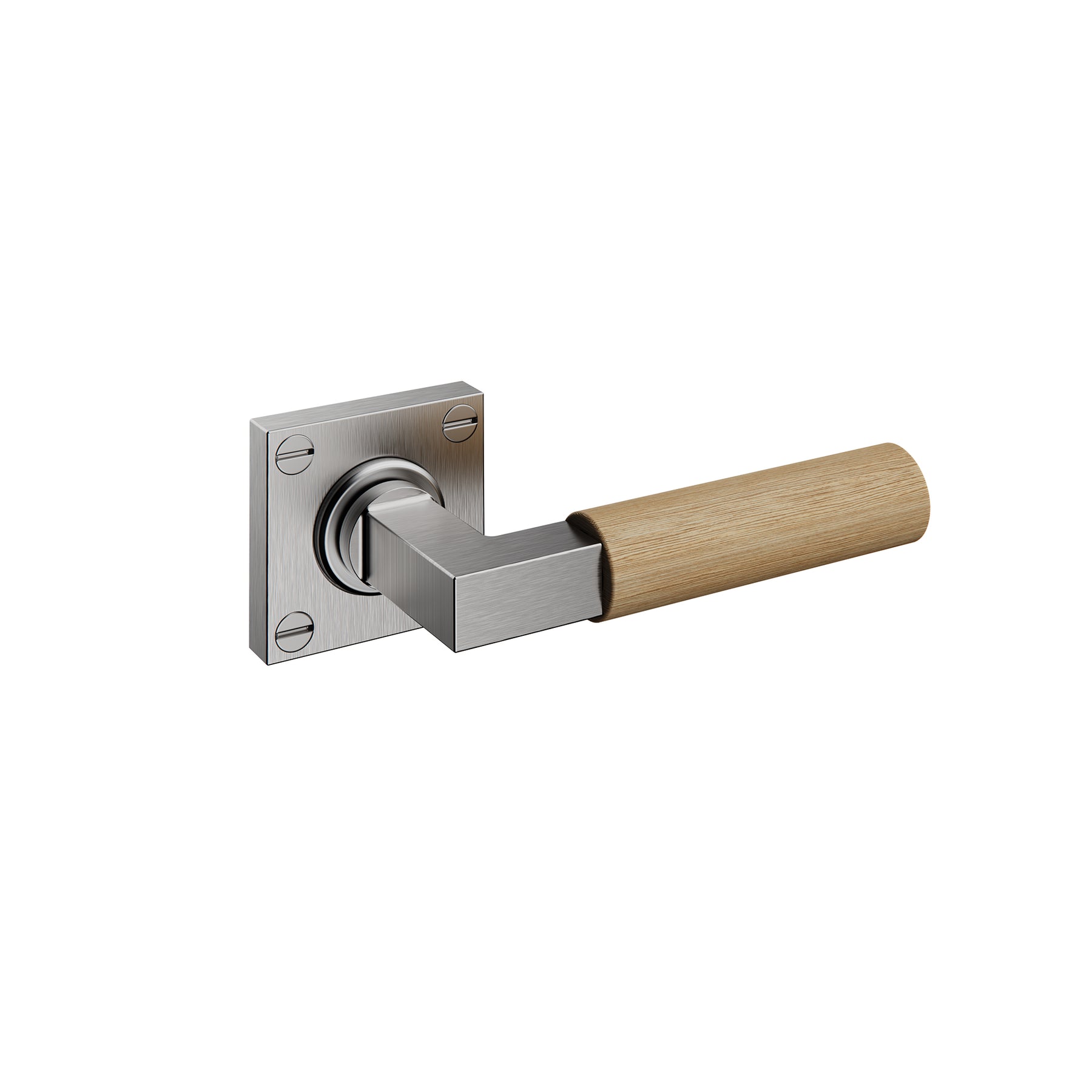 JNF Bauhaus set of two (pair), Walter Gropius inspired, grade 304 stainless steel and natural FSC certified birch wood door lever handles on square visible fixing solid sprung roses, 8mm spindle bar, supplied complete with bolt through fixings and screws.