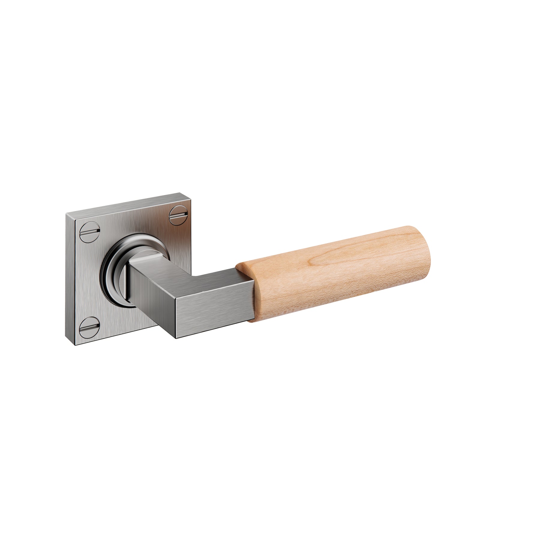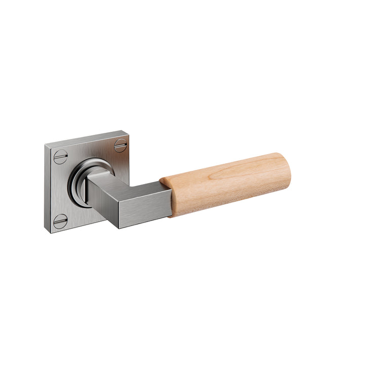 JNF Bauhaus set of two (pair), Walter Gropius inspired, grade 304 stainless steel and natural FSC certified birch wood door lever handles on square visible fixing solid sprung roses, 8mm spindle bar, supplied complete with bolt through fixings and screws.