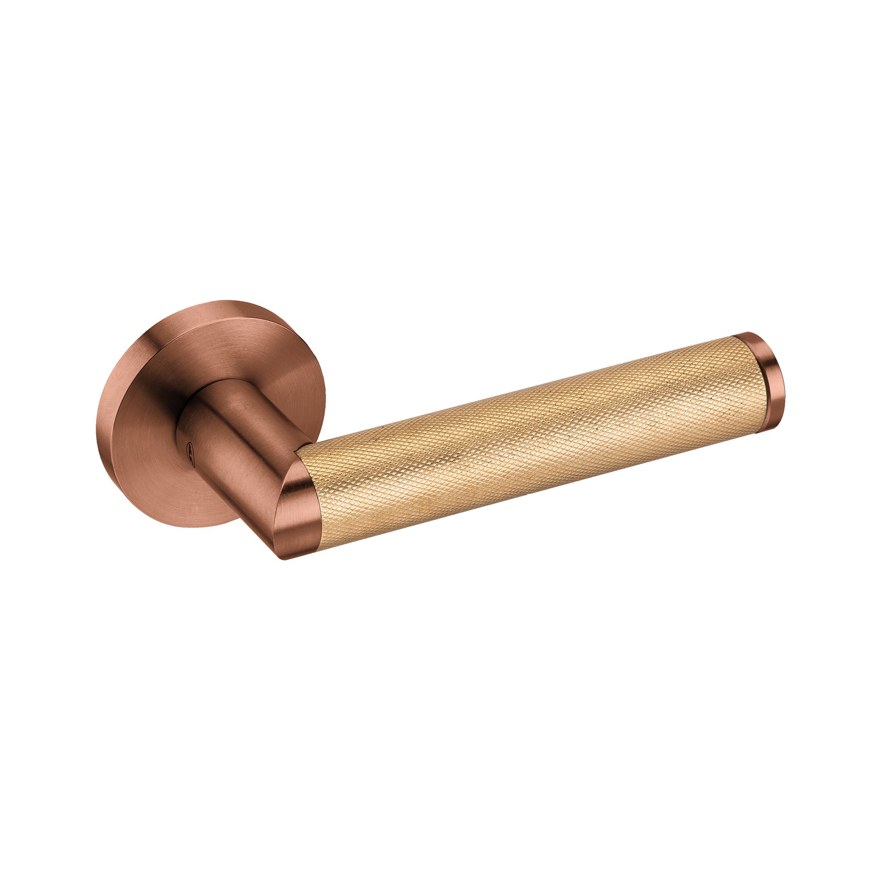 A pair (set of two) JNF Link System grade 304 stainless steel and knurled unlacquered brass grip door lever handles on round concealed fixing sprung roses, 8mm spindle bar, supplied complete with bolt through fixings and screws.