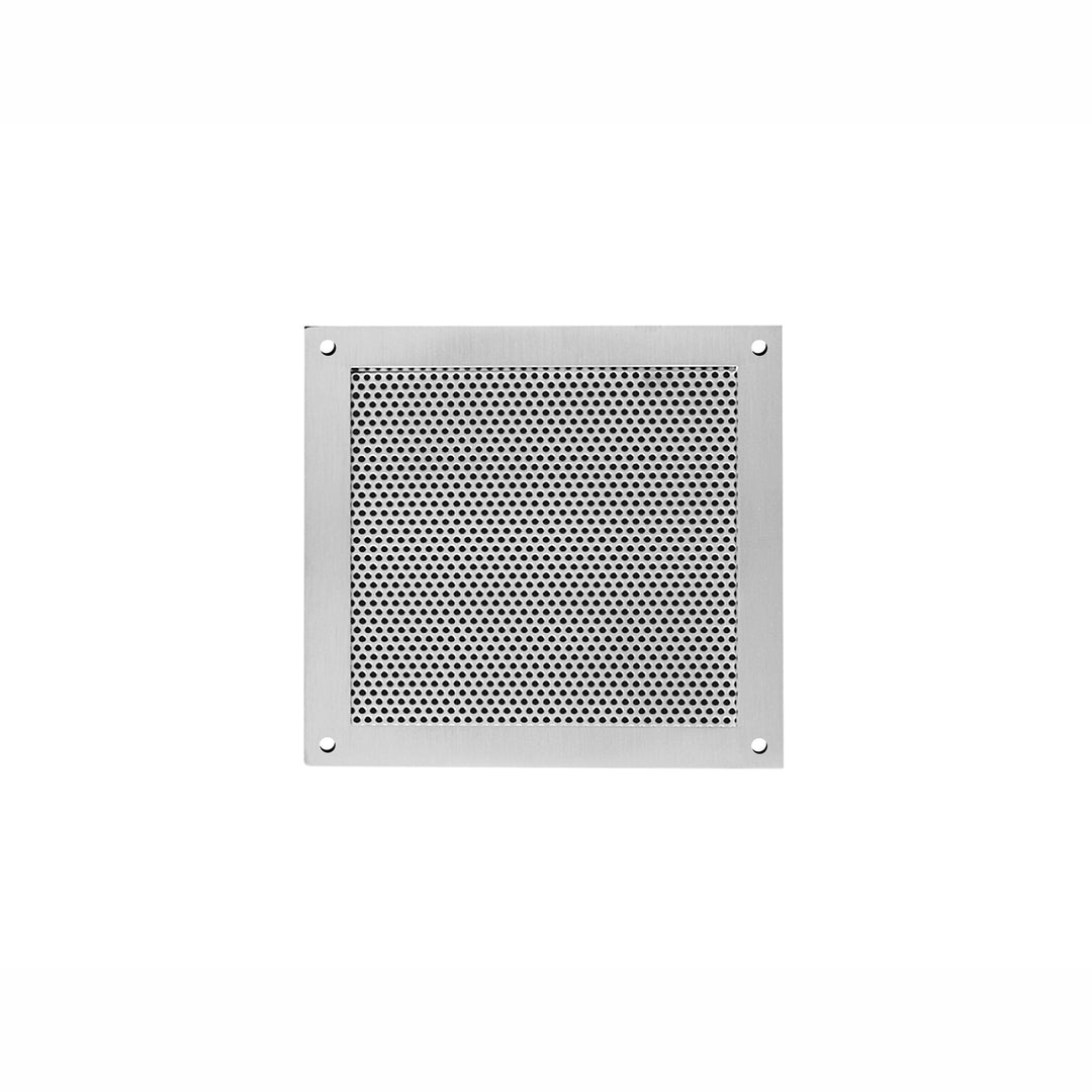 JNF grade 304 4mm thick satin stainless steel 150mm square ventilation grill plate with 10mm wide visible fixing frame, 130mm diameter ventilation. 22% free-area.