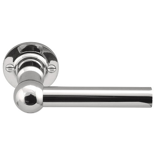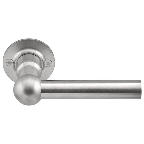 A set of two (pair) stainless steel "Chemin de Fer" door lever handles on solid stainless steel visible fixing roses complete with screws and bolt through fixings to suit doors 44mm thickness.