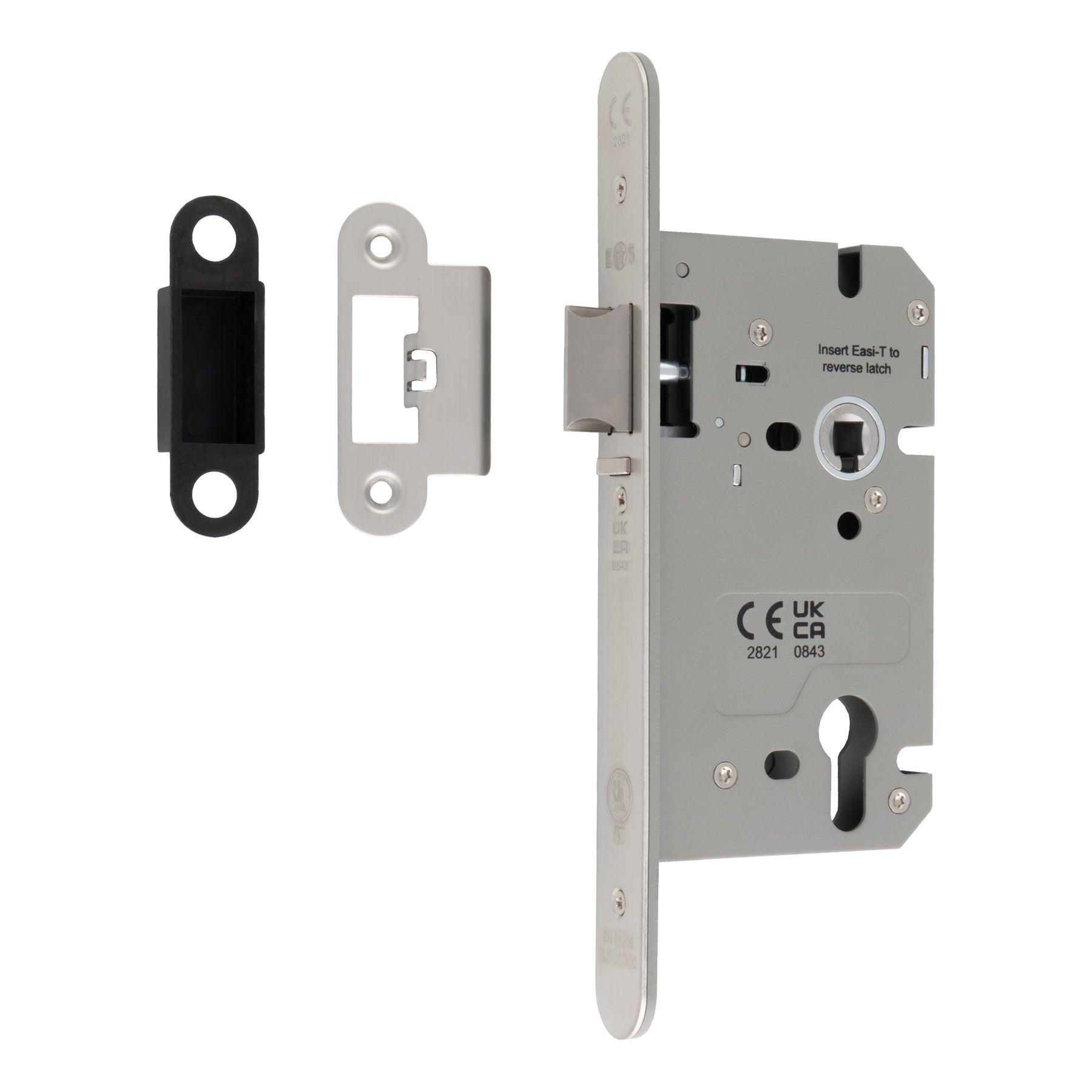 Heavy duty DIN European mortice strongly sprung (Grade 3) nightlatch case with two-piece 24mm wide radius forend and anti-rattle striking plate (with black boxed keep), with stainless steel reversible latch bolt; suitable for domestic and commercial projects.