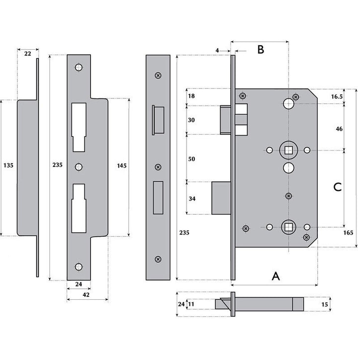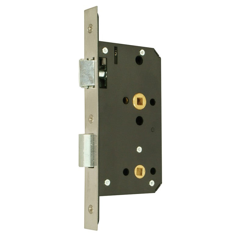 Heavy duty DIN European mortice bathroom lock case with two-piece 24mm wide forend and striking plate (with boxed keep), with stainless steel deadbolt; suitable for domestic and commercial projects.