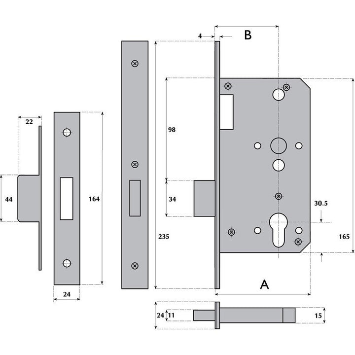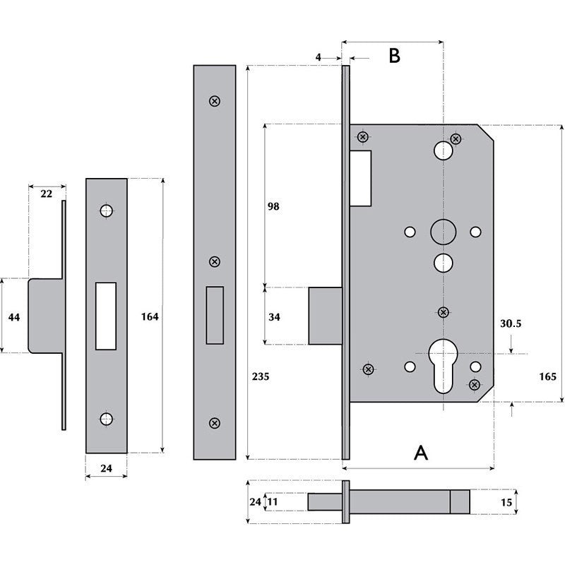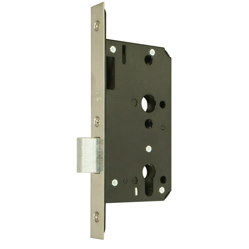 Heavy duty DIN European mortice euro profile cylinder deadlock case with two-piece 24mm wide forend and striking plate (with boxed keep), with stainless steel deadbolt; suitable for domestic and commercial projects.