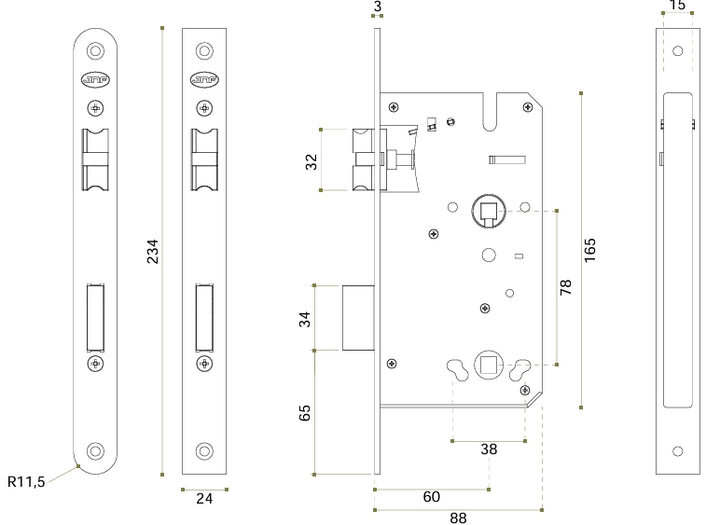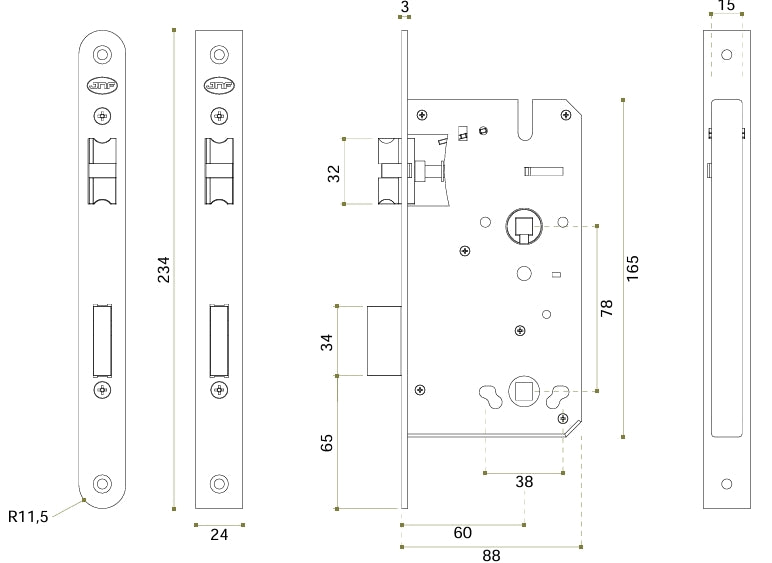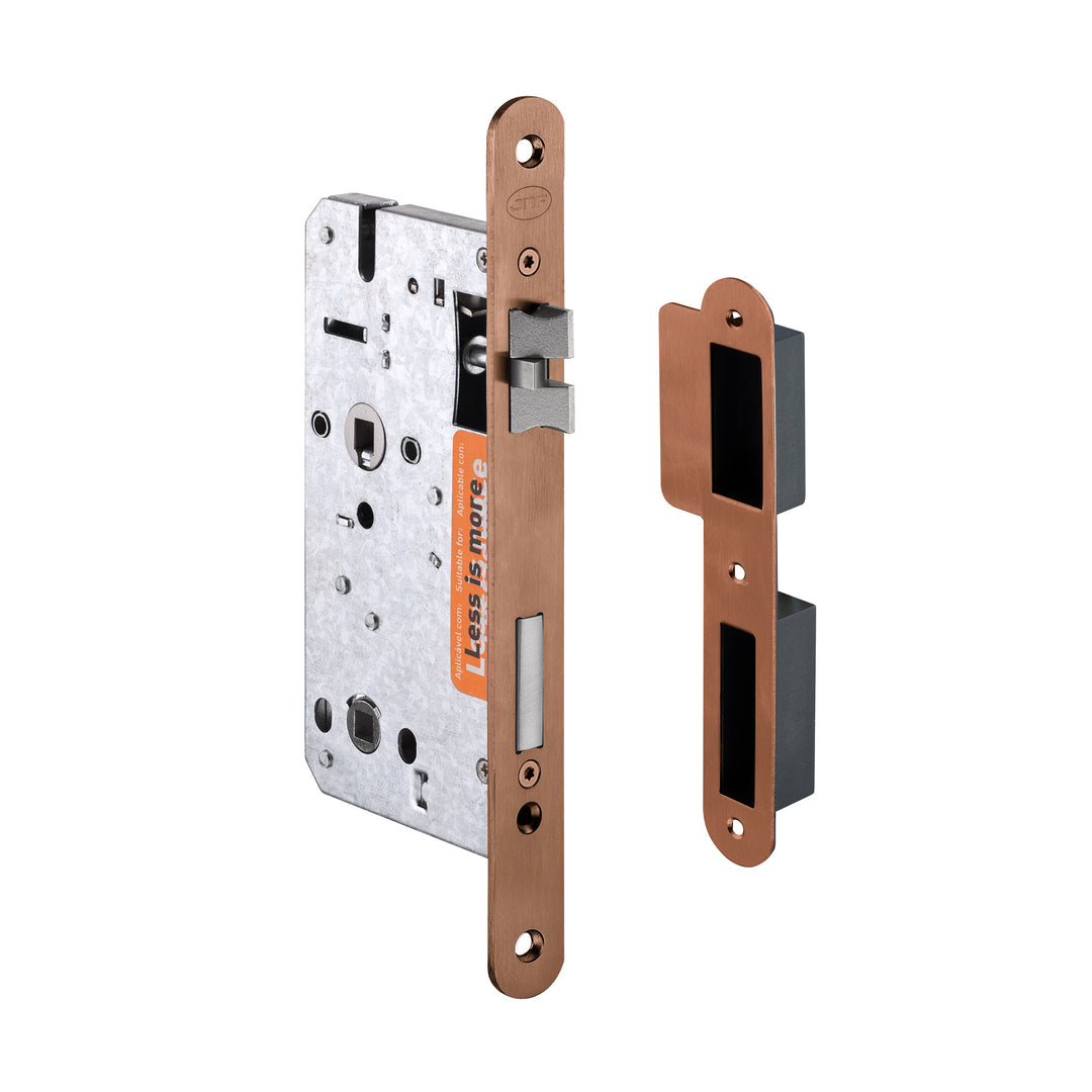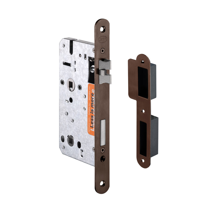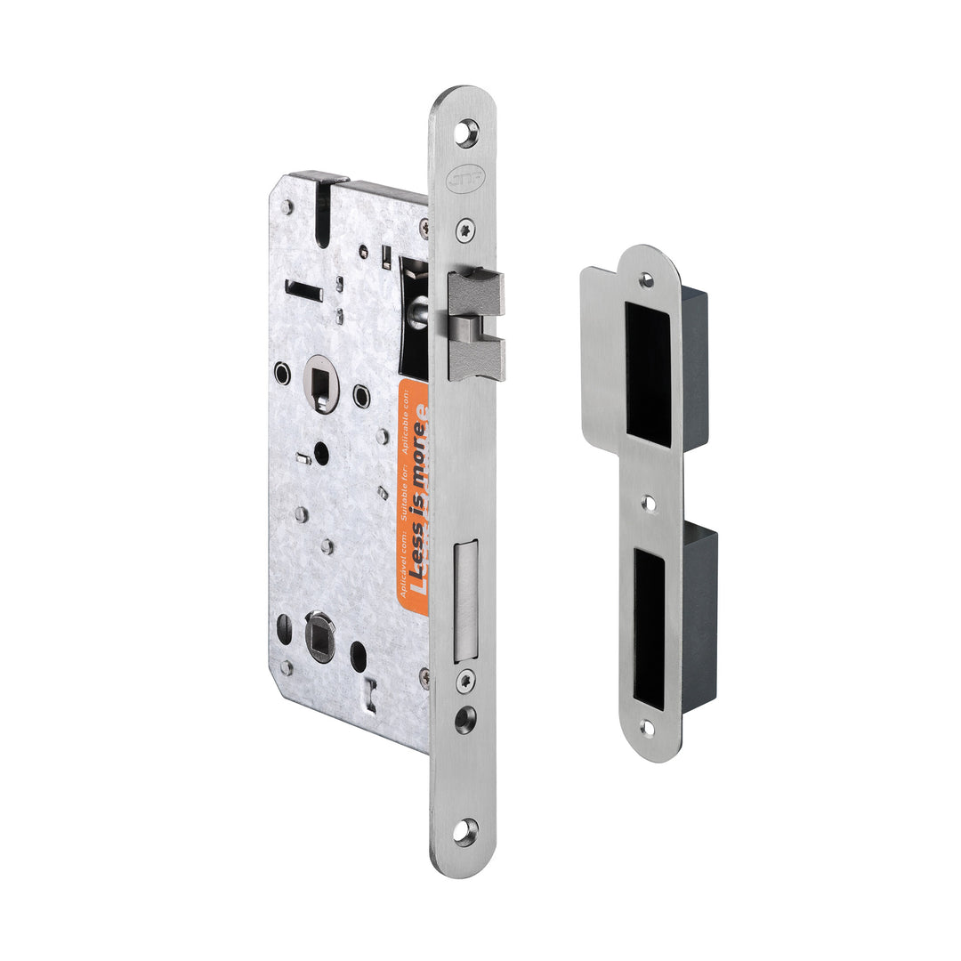 JNF mortice flush mounted grade 3 DIN silent adjustable bathlock, supplied with matching radius forend and boxed keep strike plate.