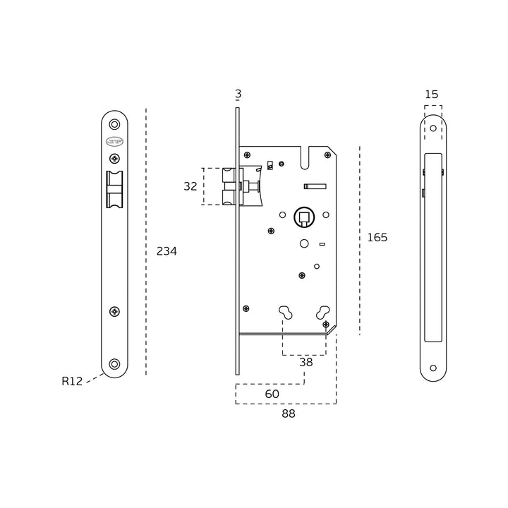 JNF mortice flush mounted grade 3 DIN silent adjustable latch, supplied with matching radiused forend and boxed keep strike plate.