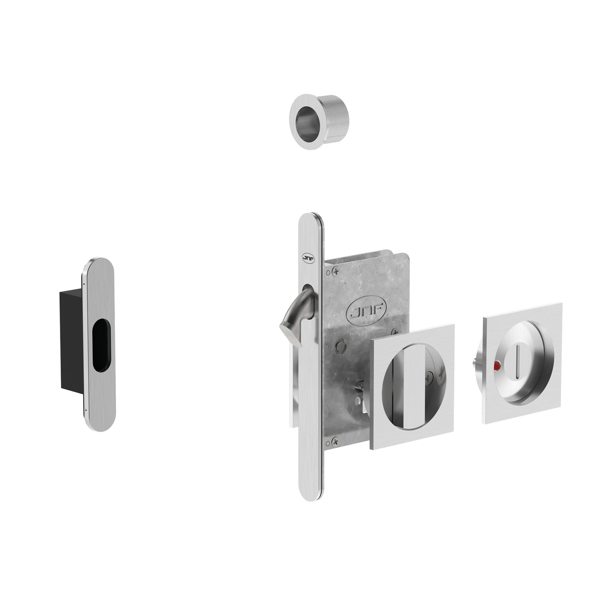 The 50mm backset sliding door lock with "snap fixing" finished forend coverplate to suit doors 36mm - 50mm thickness is supplied with a matching finish 30mm diameter circular edge pull.