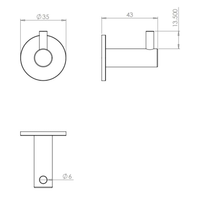 A single Baltic Grade 316 stainless steel 14mm diameter x 43mm projection wall mounted coat pin hook with 35mm diameter circular rose