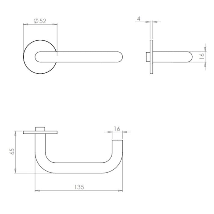A pair of Baltic Grade 316 solid stainless steel 135mm (overall) 16mm U Safety (return to door) lever handles on 52mm diameter x 4mm thick concealed fixing unsprung ball bearing roses, complete with 8mm spindle bar to suit 44mm thick doors.