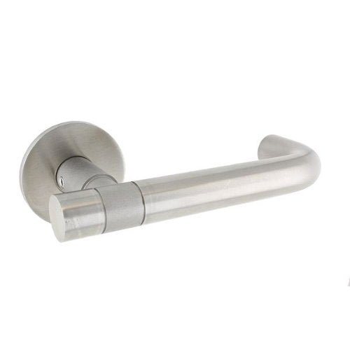 A pair of Baltic Grade 316 solid stainless steel 145mm (overall) 19mm safety "return to door" lever handles, with sand-blasted 68mm projection node on 52mm diameter x 4mm thick concealed fixing unsprung circlip roses, complete with 8mm spindle bar to suit 44mm thick doors.