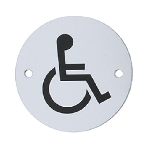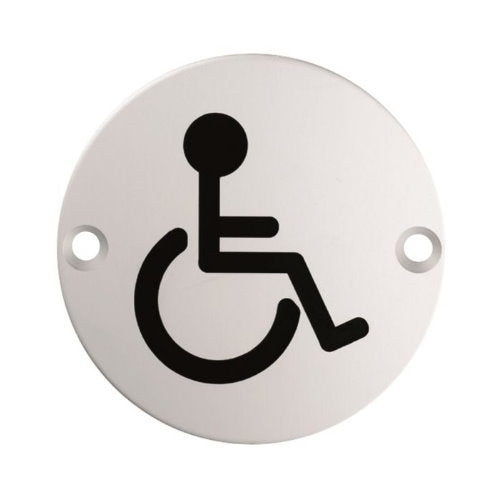 Eurospec stainless steel screen printed black ambulant (disabled) symbol disc sign, supplied with screws.