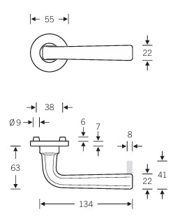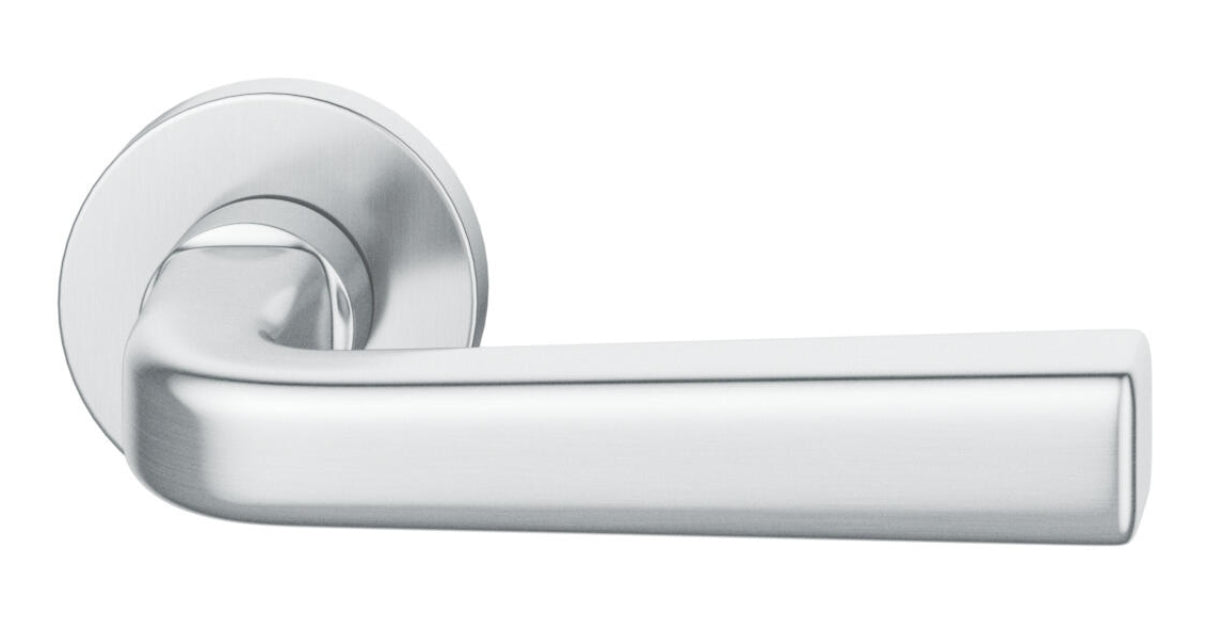 A pair (set of two) FSB 1254 satin grade 304 stainless steel un-sprung lever handle set, complete with concealed fixing roses, to suit doors 39mm - 58mm thick.