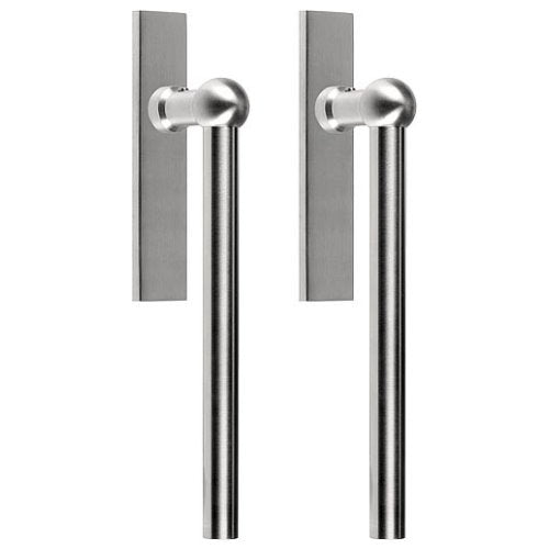 A solid pair of stainless steel lift-up sliding door handles on blank plates.