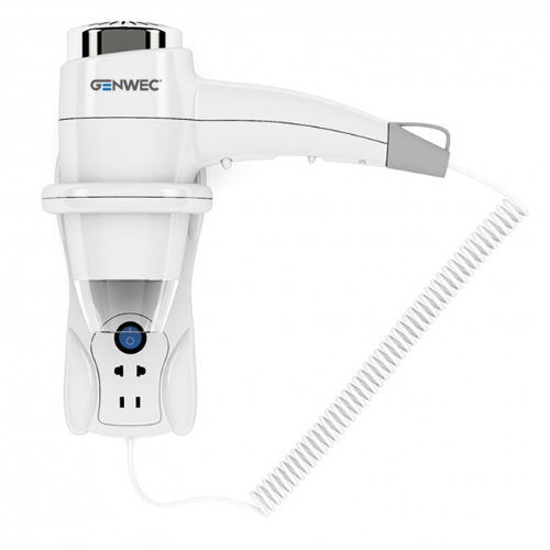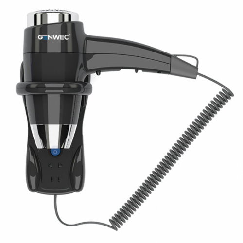 Pistol-type hot air hair dryer with wall mount. Both the mount and the hair dryer are made in white ABS plastic. The mount is fixed to the wall with two screws, for which two holes need to be drilled in the wall using a 6 mm drill bit. On the front of the hair dryer mount, there is a main switch with an indicator light and two shaver sockets, a 110V flat pin and the other a 230V round or flat pin. On the front of the pistol-type handle, there is a switch with three positions: ‘C’ – minimum flow/cold air, ‘1’ – minimum flow/hot air and ‘2’ maximum flow/hot air.