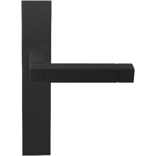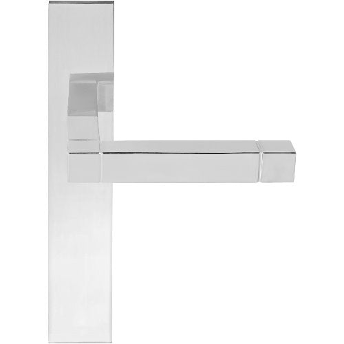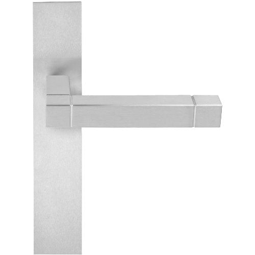 A set of two (pair) square stainless steel straight door unsprung lever handles with back plates, one side with concealed fixings and the other side with visible fixings. Designed by Jan Des Bouvrie