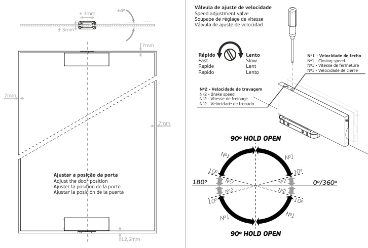 The pivot can rotate through 360 degrees in both directions with hold open at 90 degrees in either direction with both closing speed (between 110-15 degrees) and soft closing (last 15 degrees), both of which can be made on the top of the bottom patch fitting.