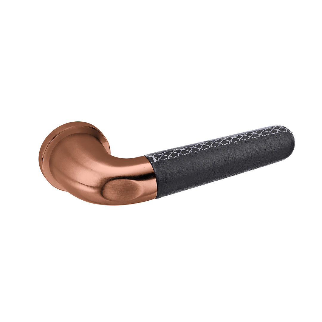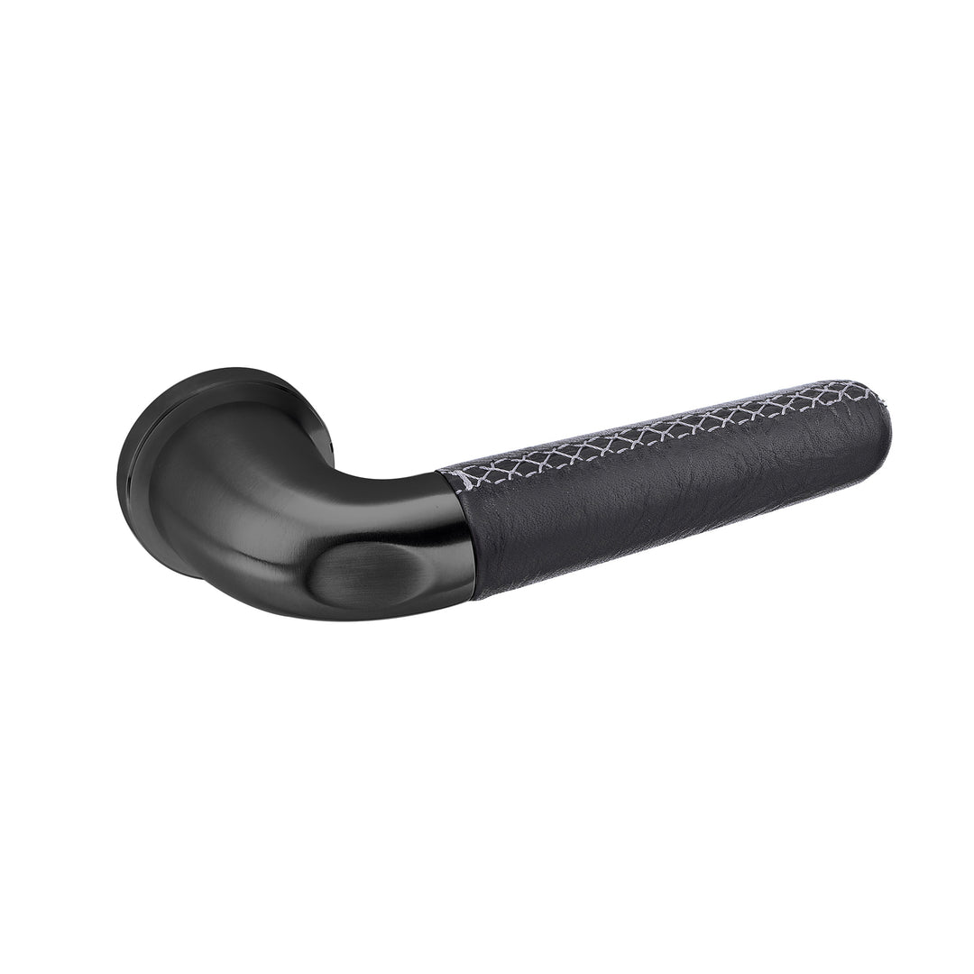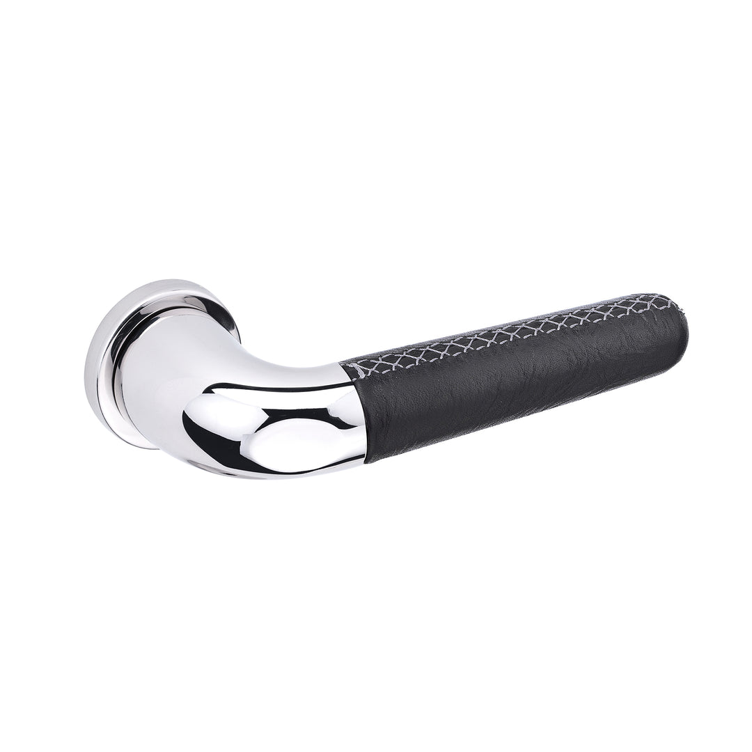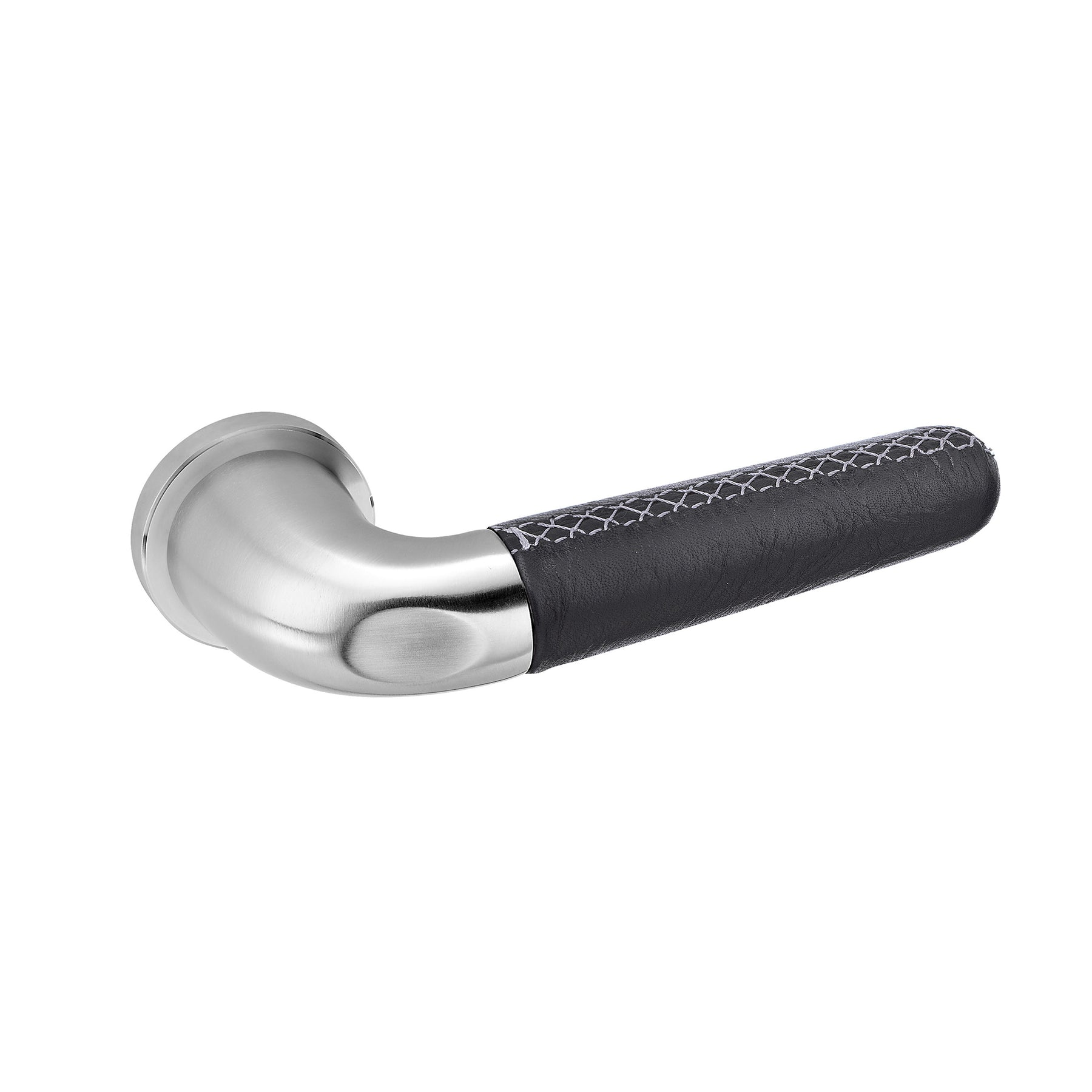 A pair (set of two) solid grade 316 satin stainless steel and black natural grey stitch leather lever handle with 50mm diameter concealed fixing roses, 8mm spindle; supplied with fixings.