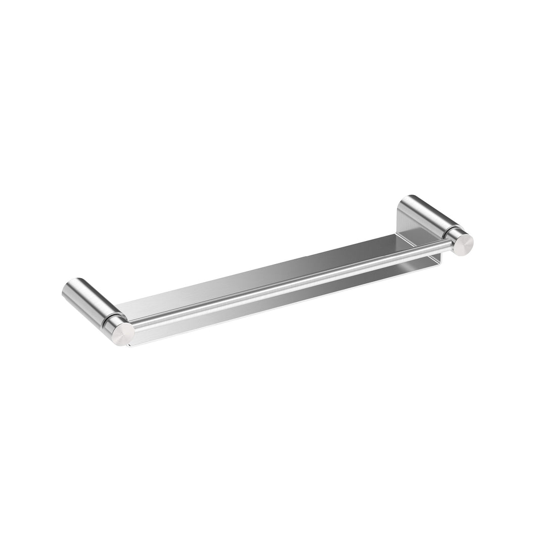 JNF Fine Series satin stainless steel shampoo soap shelf with removable stainless steel tray to allow for easy cleaning.