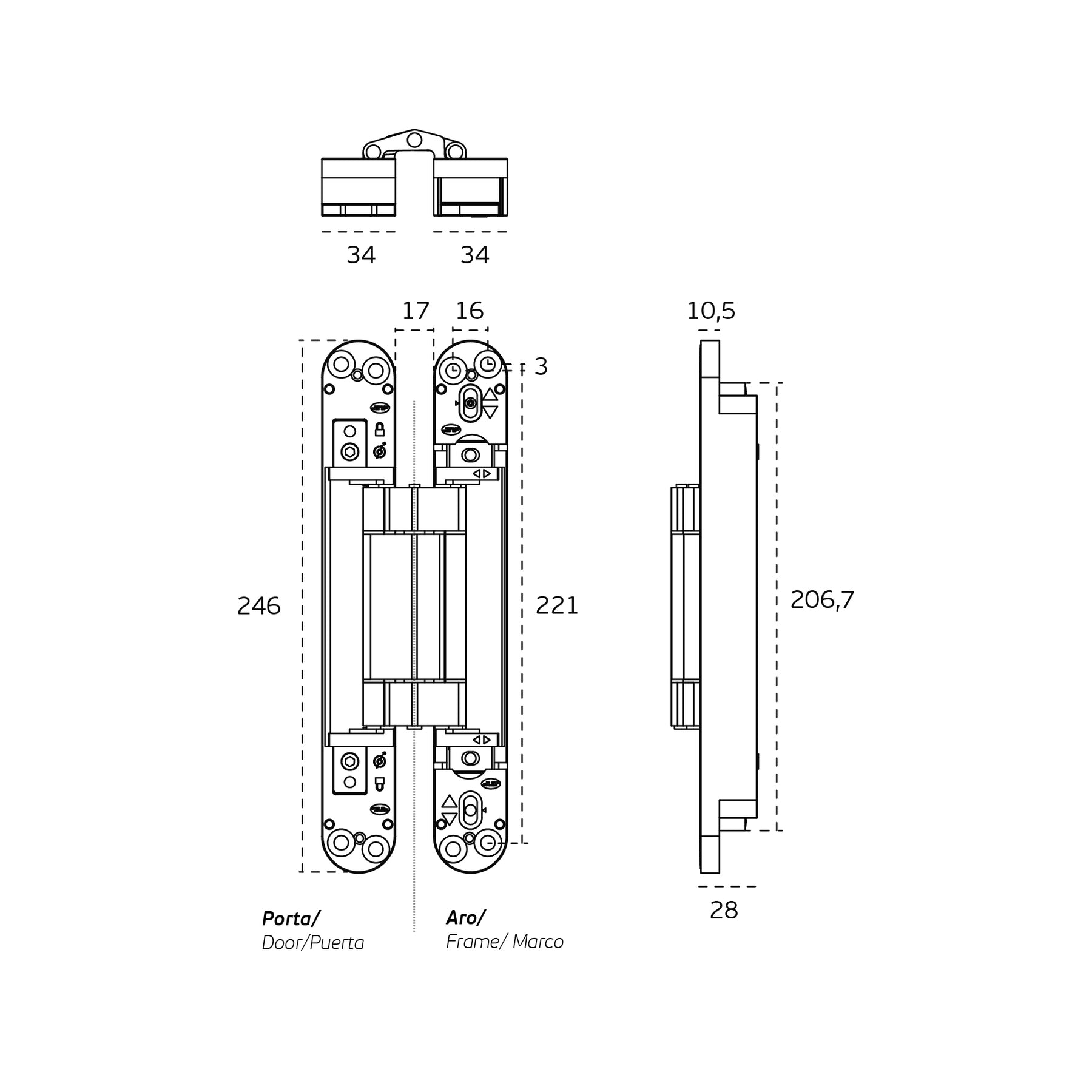 Suitable for timber, steel or aluminium frames with 3 dimensional adjustment (+/-2.5mm side and height and +/-1.5mm compression). 120 degree opening angle.