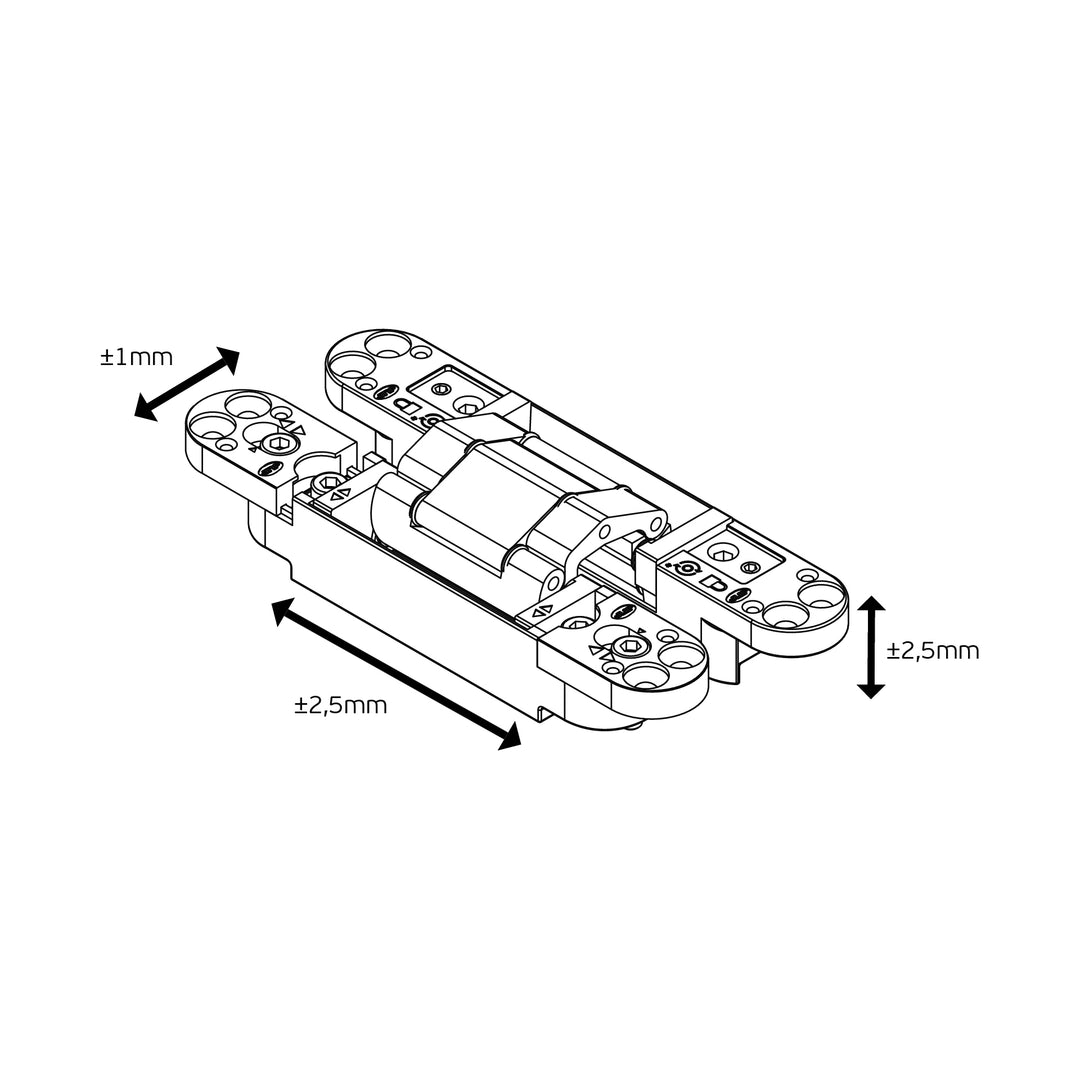 JNF Coplan 3D powder coated concealed hinge suits doors up to 130kgs (two hinges per door) or 190kgs (three hinges per door), to suit max leaf size 2000mm high x 1000mm wide with a minimum door thickness of 40mm.