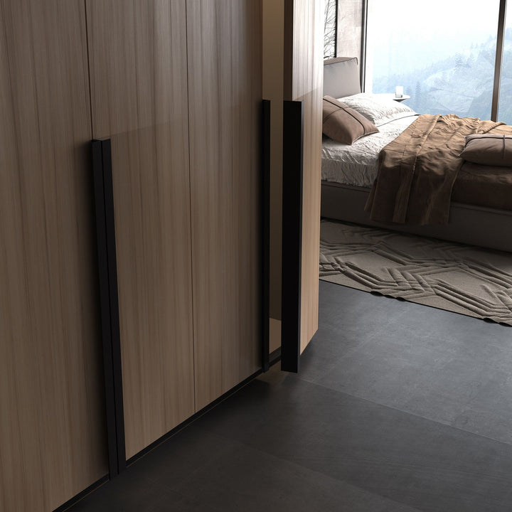 JNF Portugal powder coated RAL 9005 Black 3mm thick cabinet door edge handle or cupboard door pull handle fitting with 6mm angle return; available in three lengths/heights.