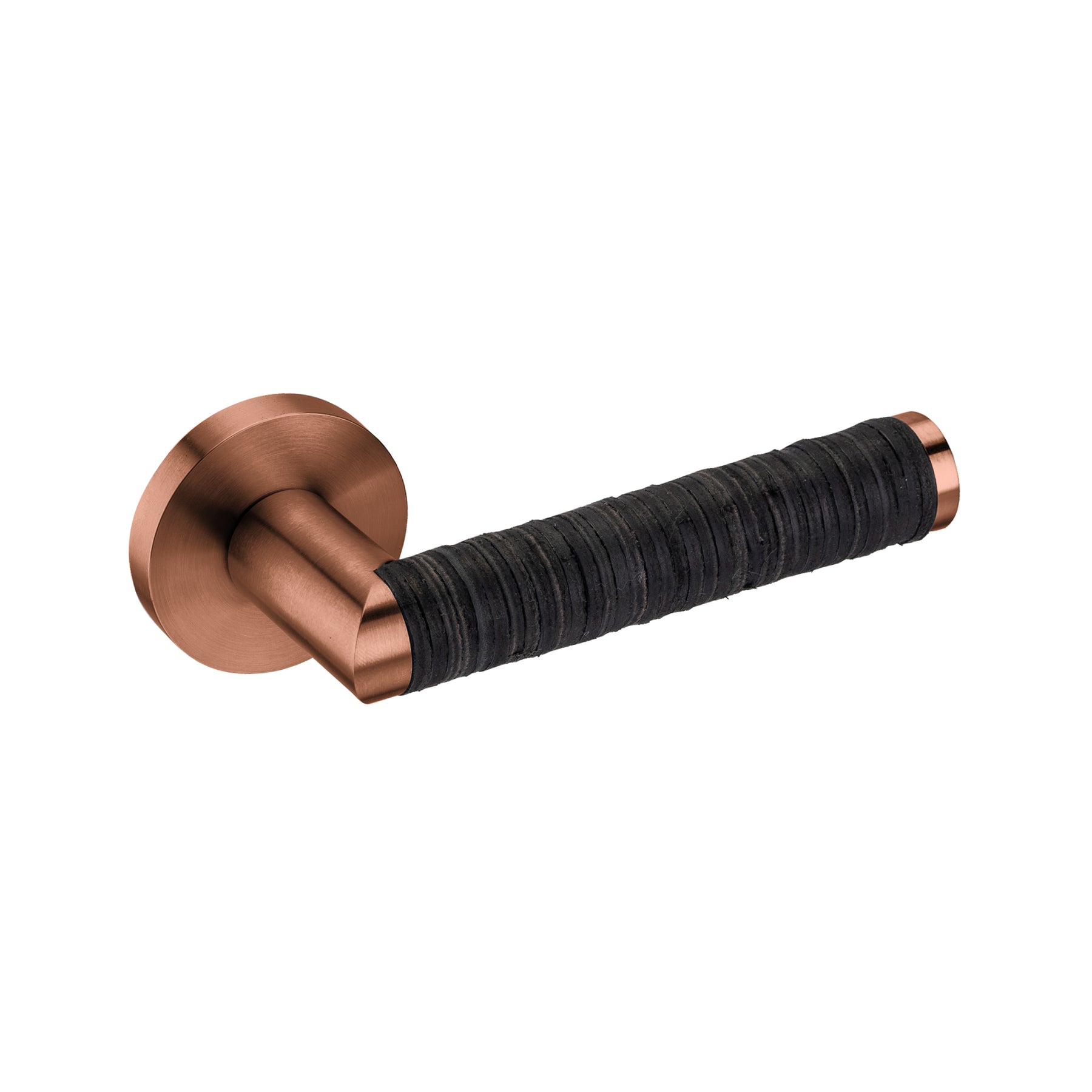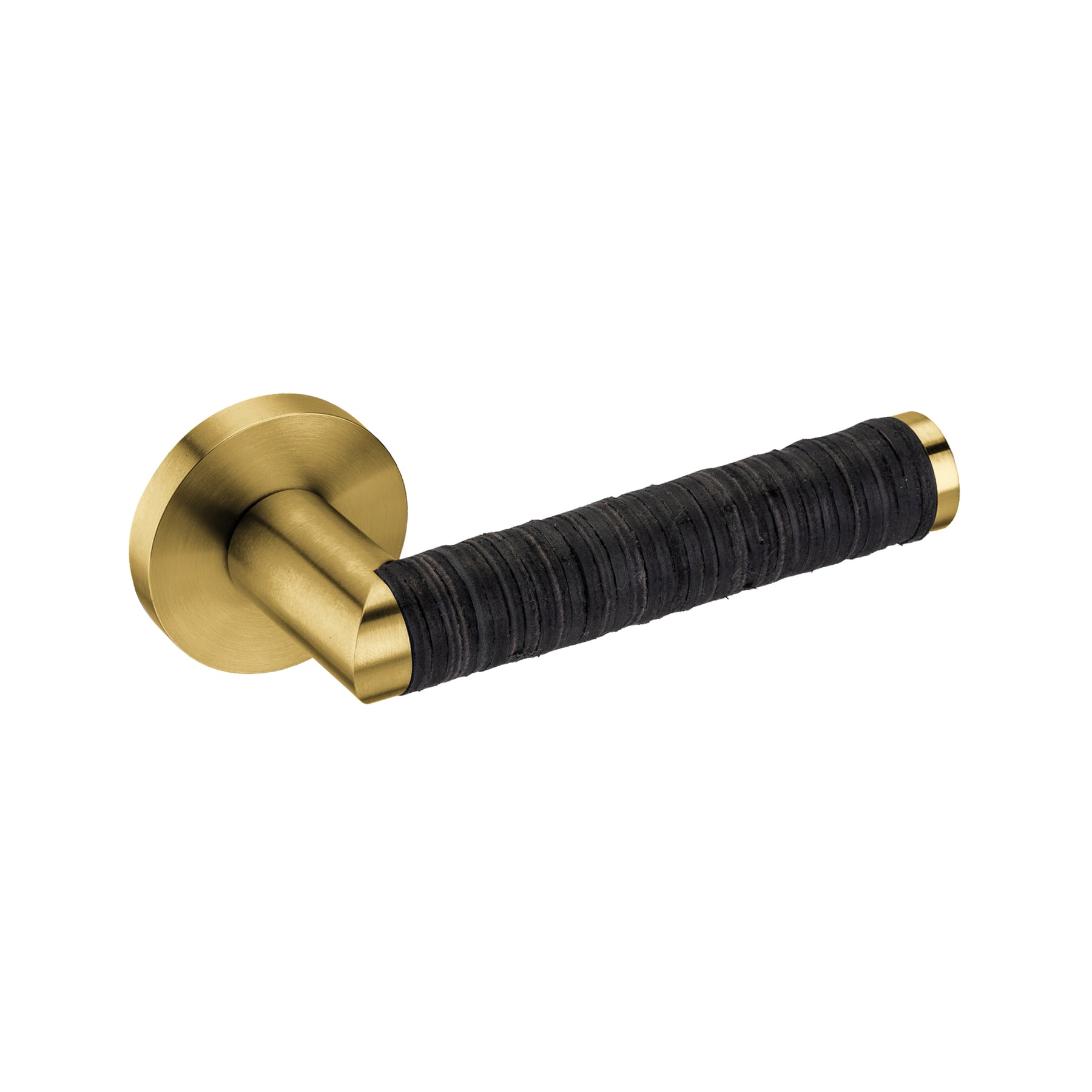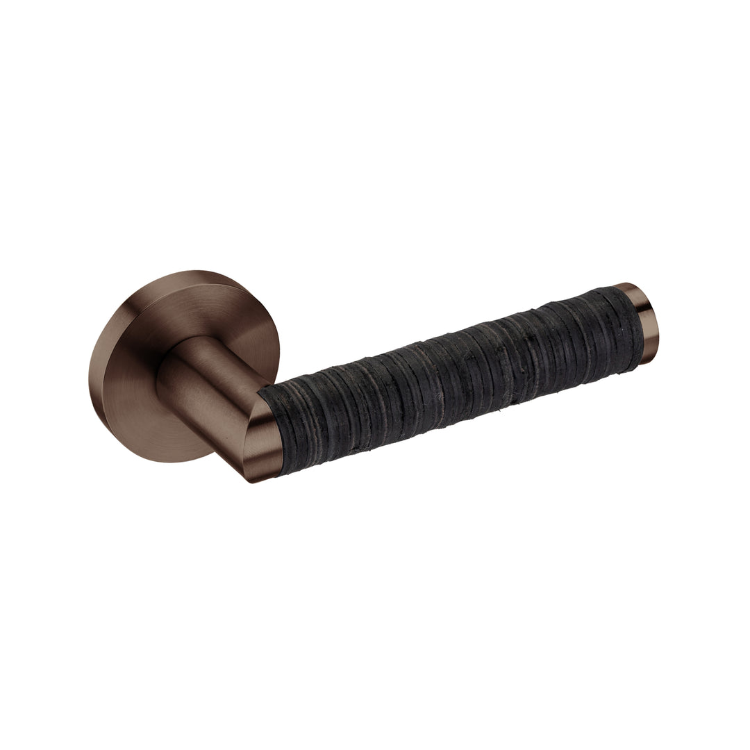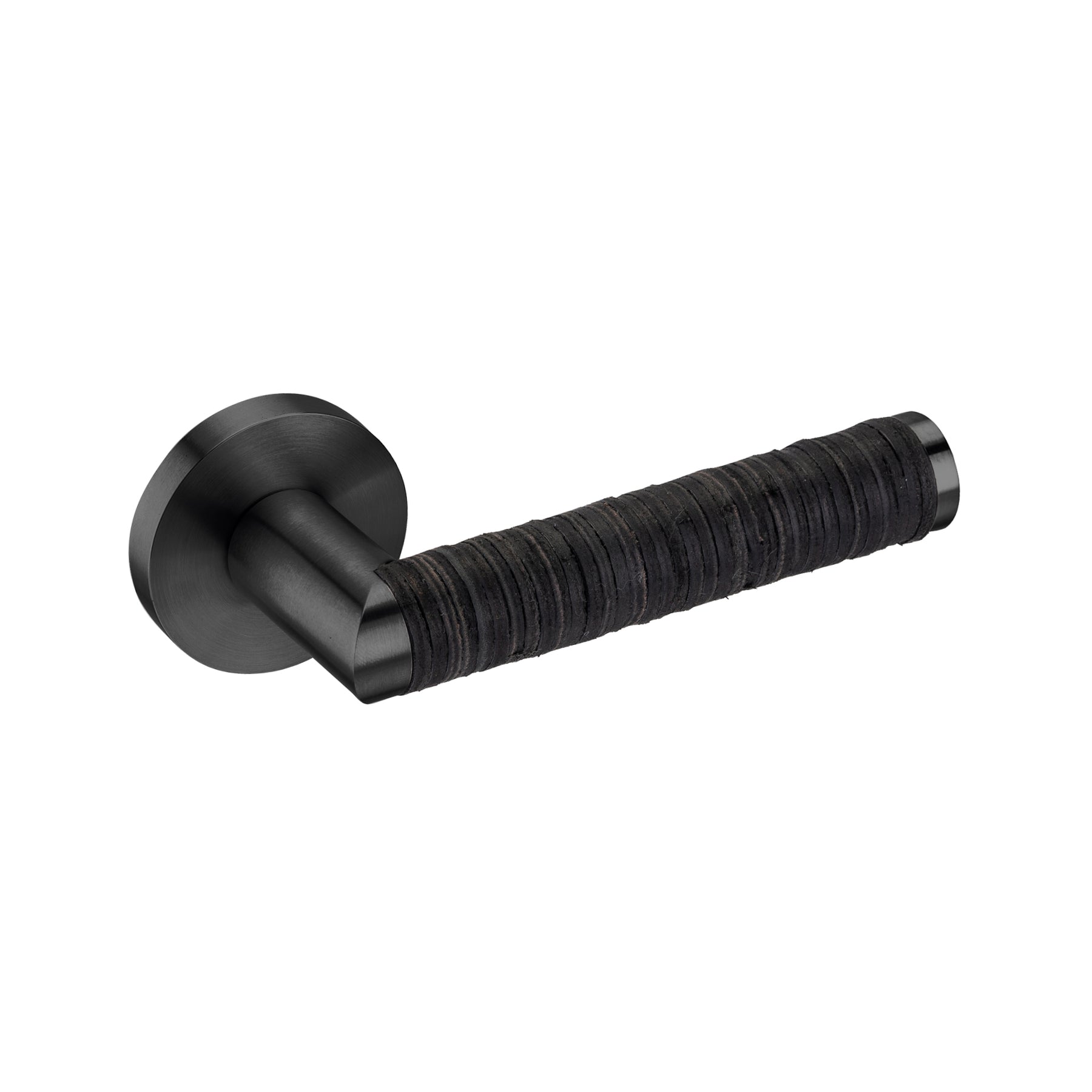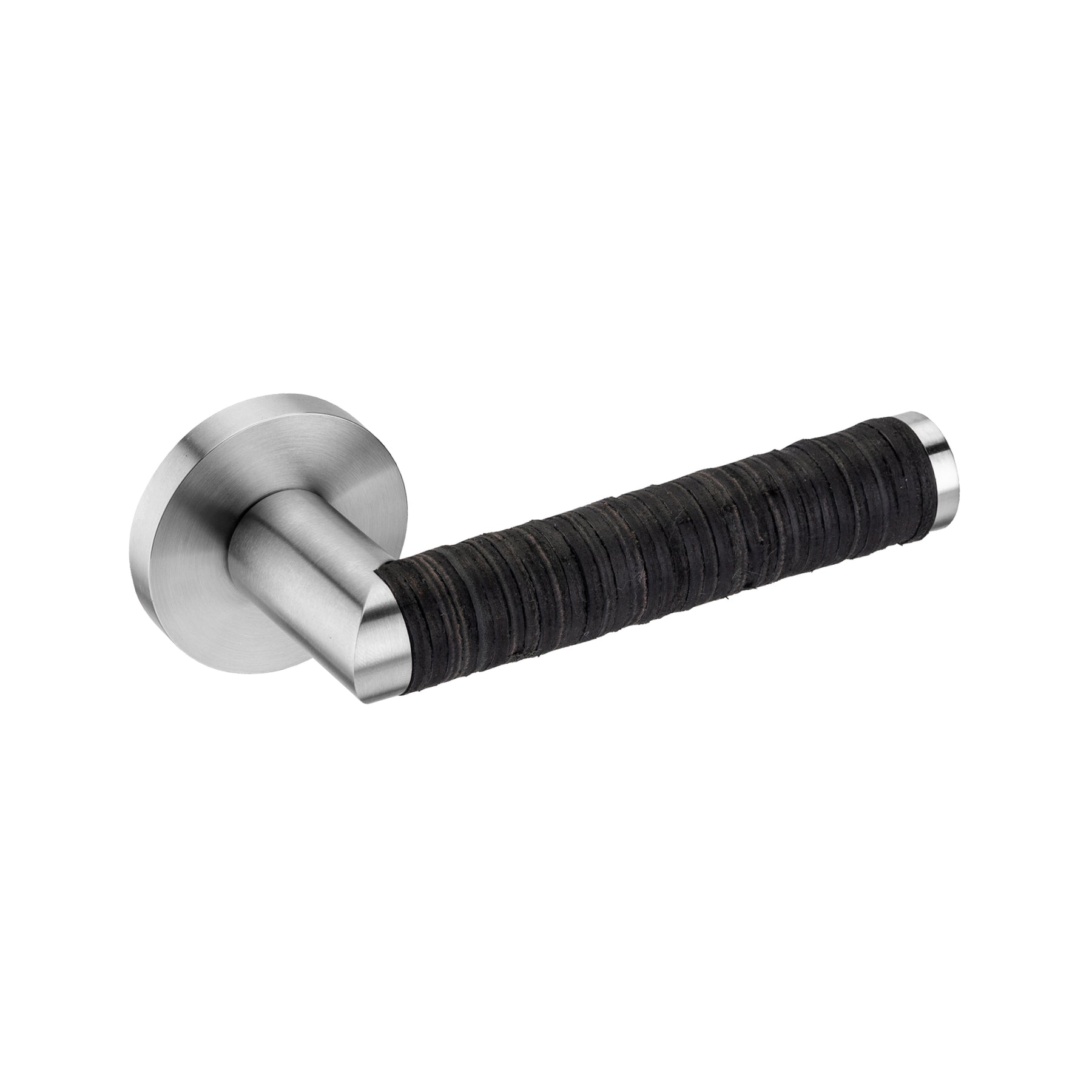 A pair (set of two) solid grade 304 stainless steel and black natural leather link bike door lever handles on round concealed fixing sprung roses, 8mm spindle bar, supplied complete with bolt through fixings and screws.