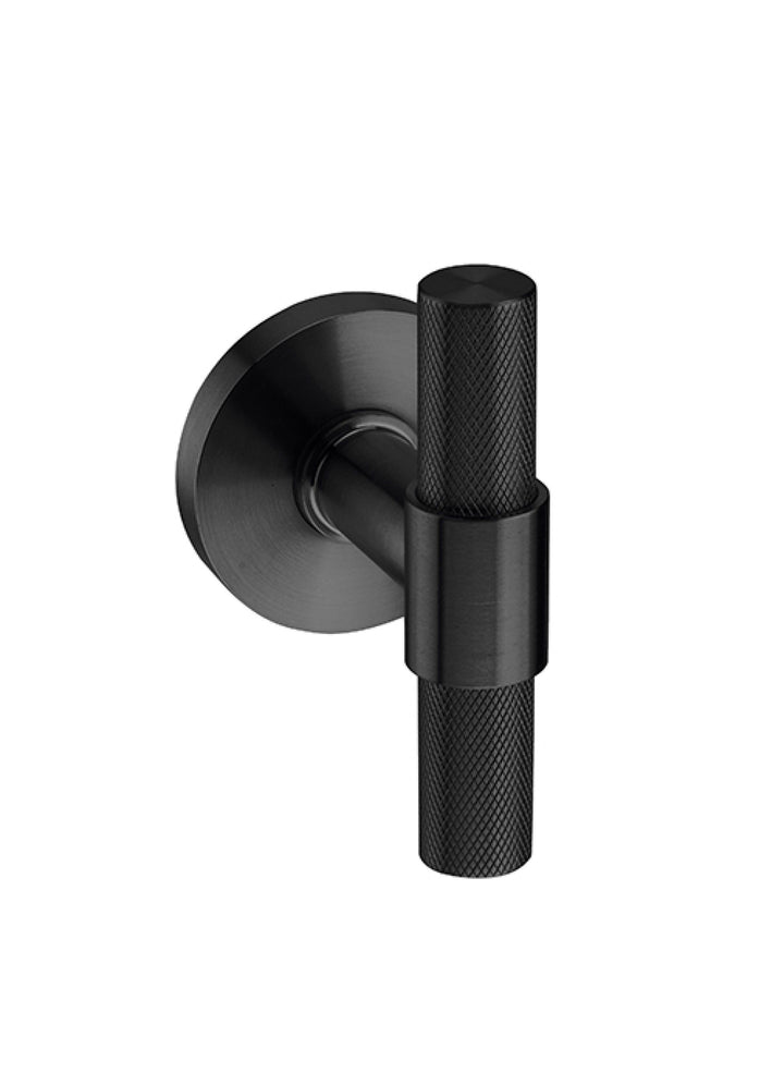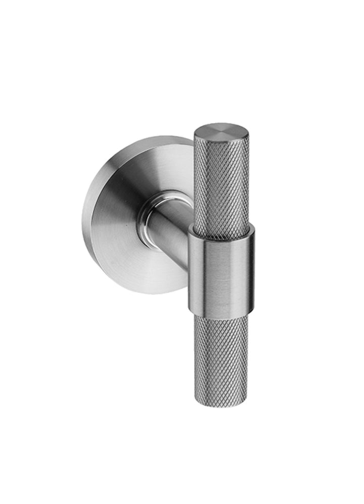 A pair (set of two) grade 304 stainless steel natur watch knurled T-bar door handles with concealed fixing two-way sprung roses, 8mm spindle bar, and bolt through fixings and screws to suit doors 44mm thickness.