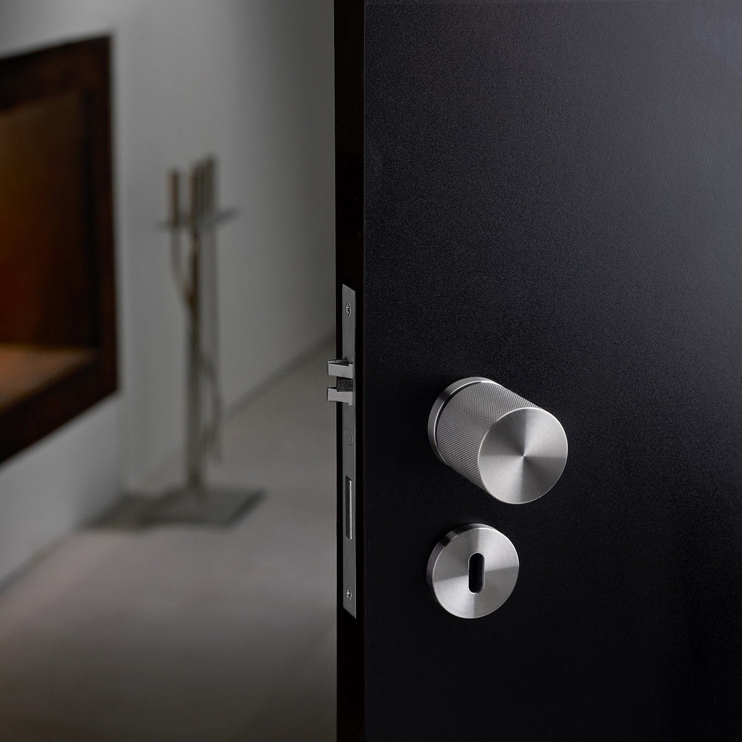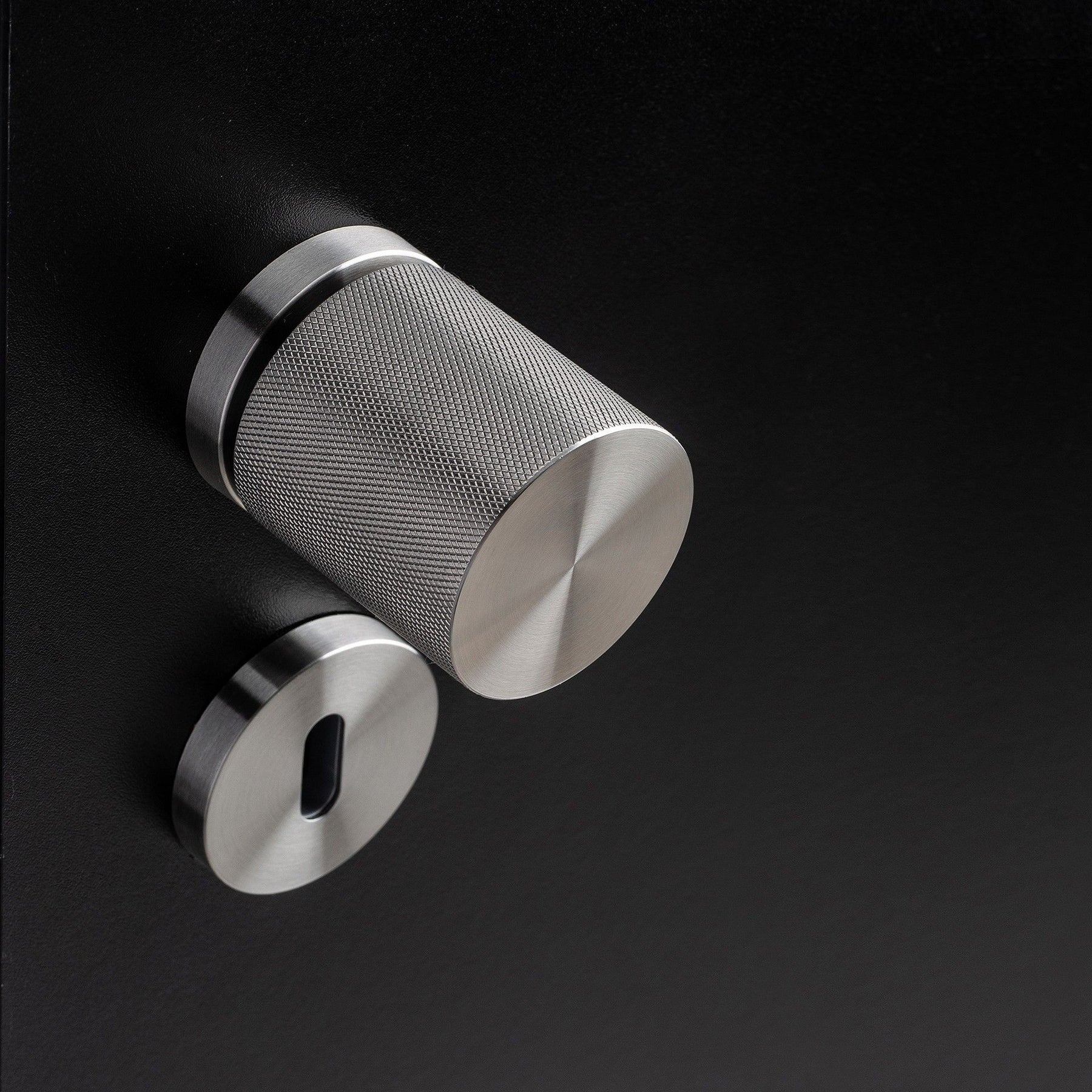 A pair (set of two) JNF Natur Watch Simple solid grade 304 stainless steel knurled door knob on round concealed fixing two-way sprung roses, 8mm spindle bar, supplied complete with bolt through fixings and screws.