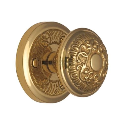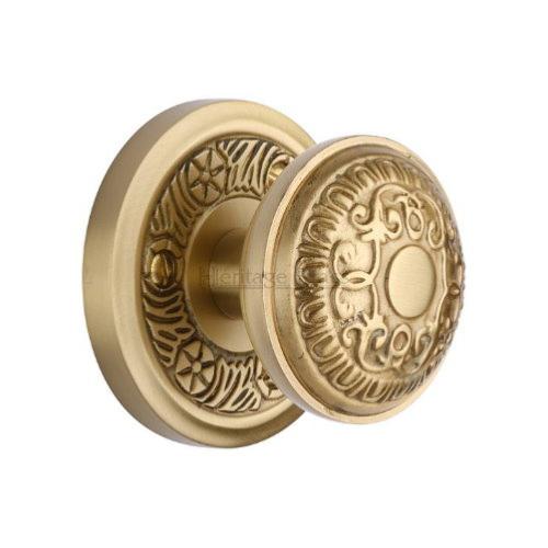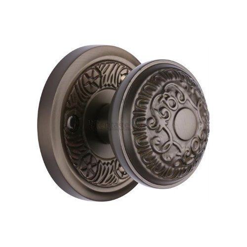A set of two heritage brass 'Aydon' design mortice knobs on visible fixing roses. Supplied complete with 8mm spindle bar and all relevant fixings.
