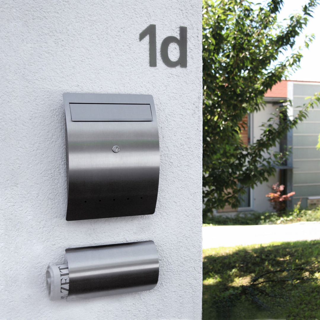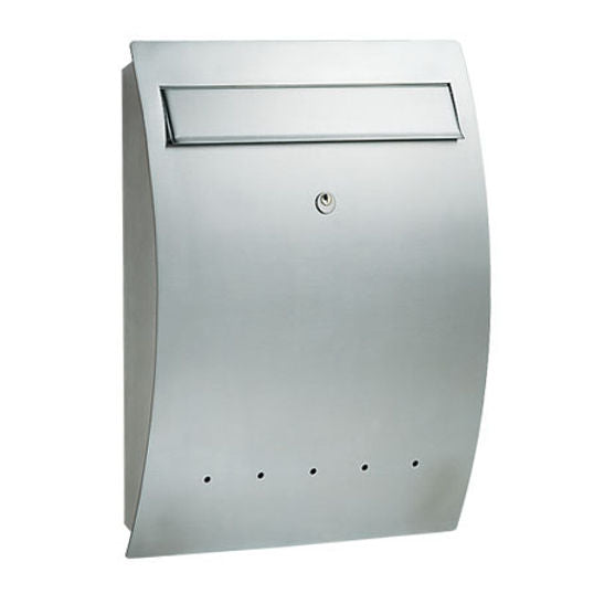 Serafini satin grade 316 stainless steel mailbox. Letters are posted into this stainless steel mailbox and retrieved by unlocking the front flap.
