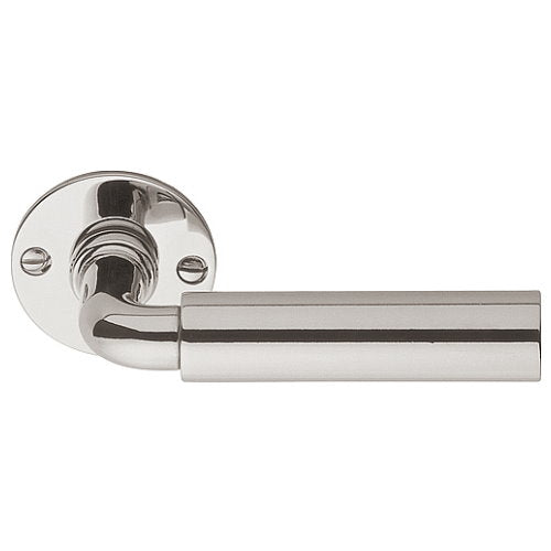 A set of two (pair) Bauhaus inspired contemporary design door handles with visible fixing un-sprung roses, 8mm spindle bar, supplied complete with bolt through fixings and slotted screws to suit doors 44mm thickness, also with a choice of finish either plain plated or with ebony wood.