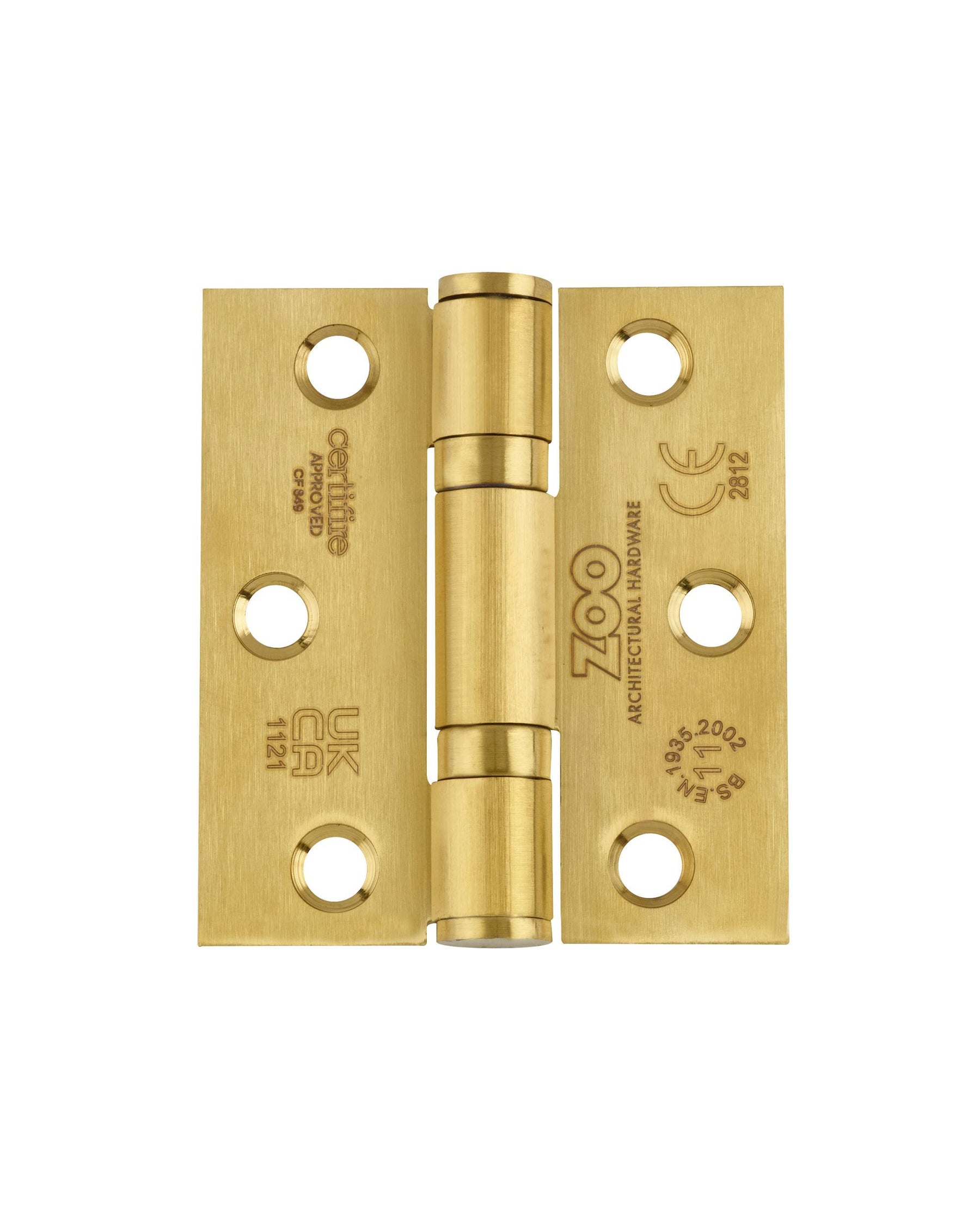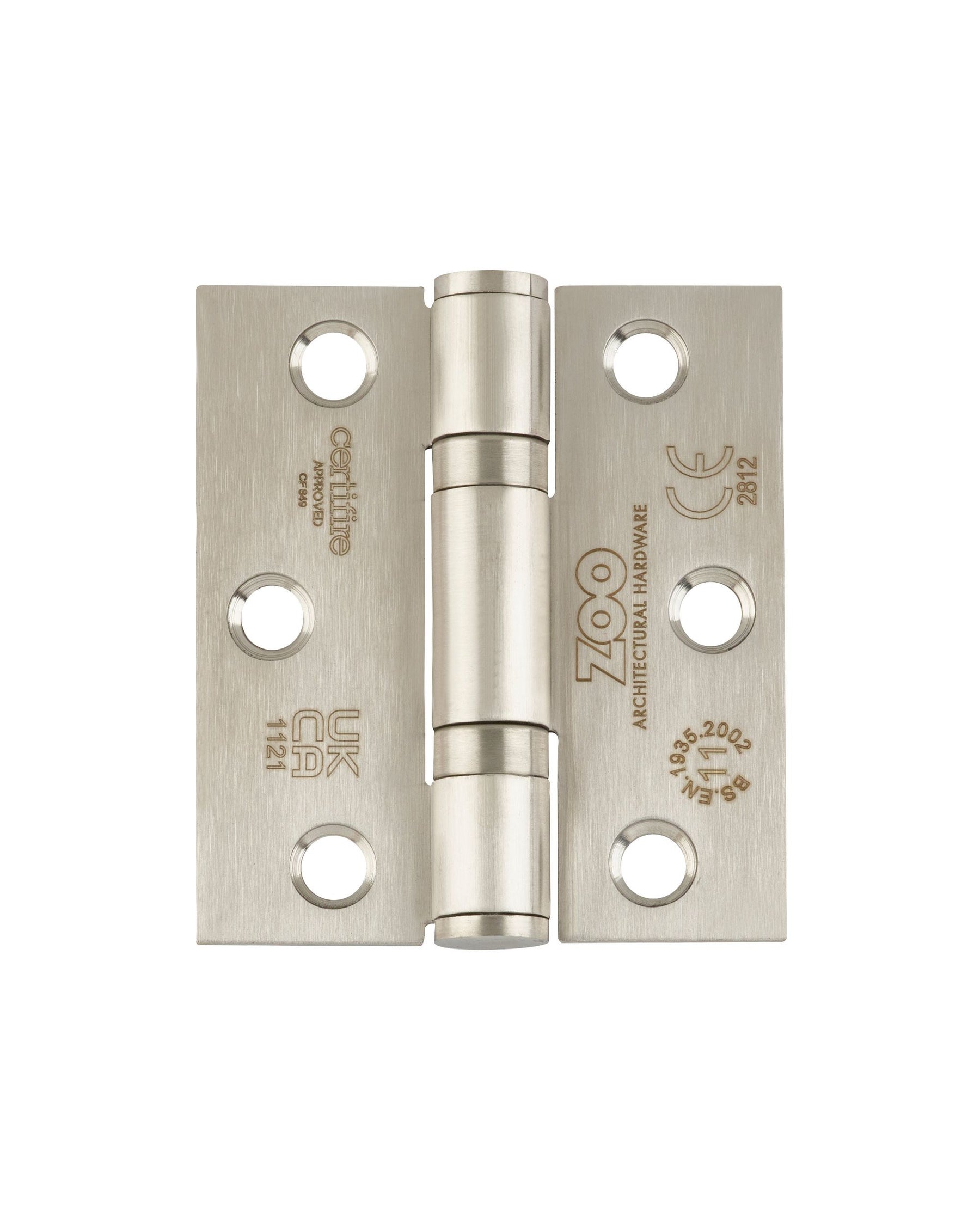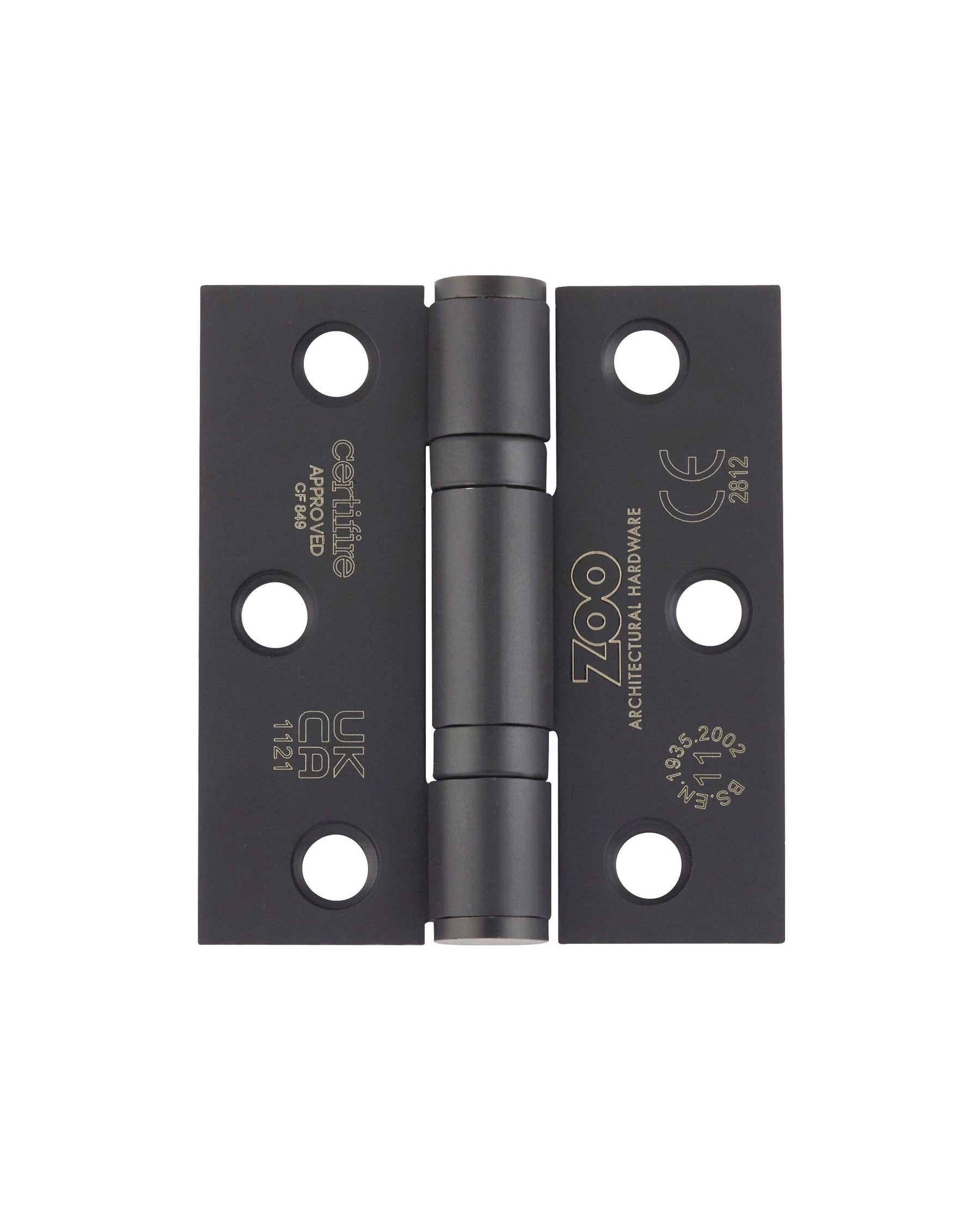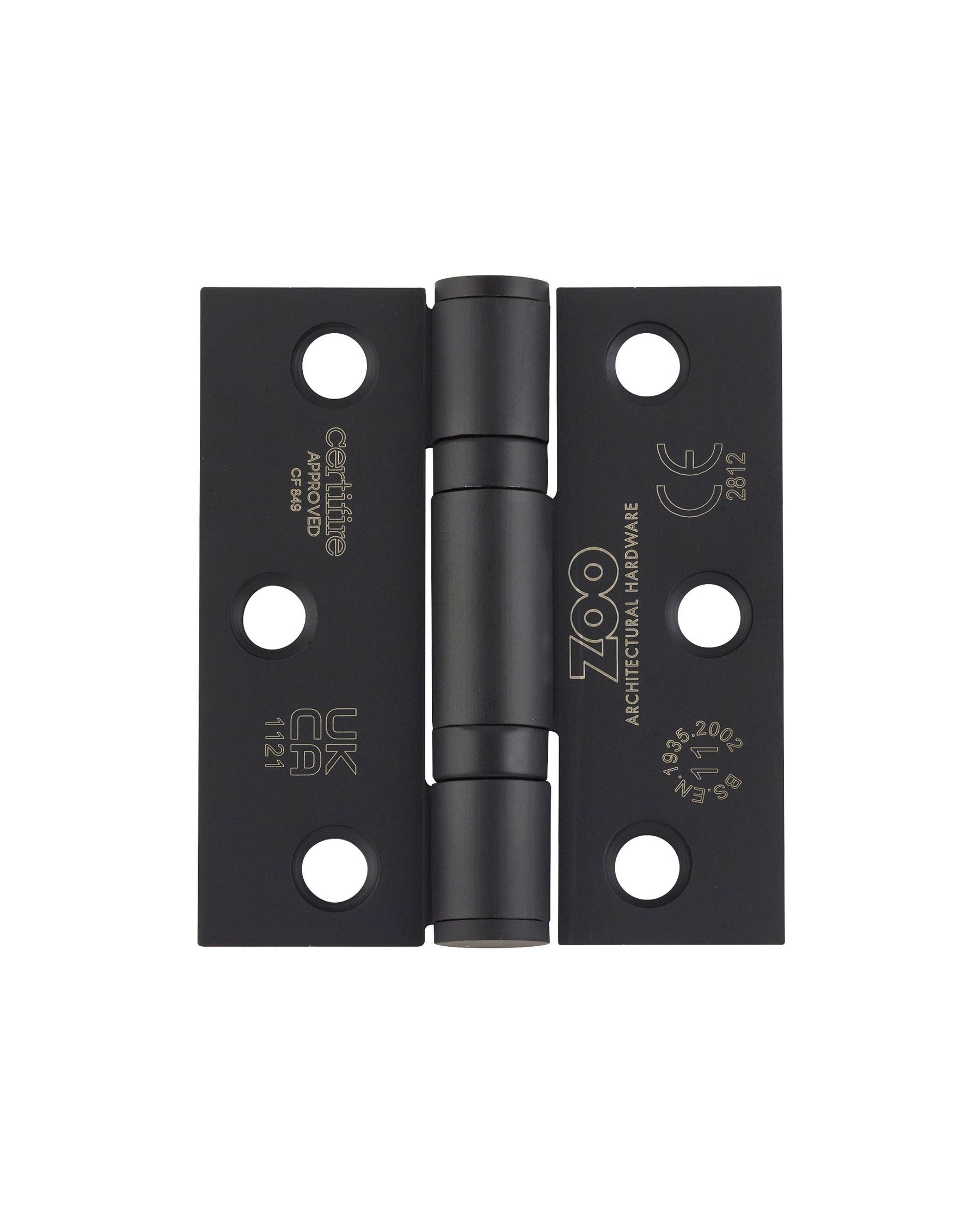 A pair (set of two) Grade 11 ball bearing hinges with square corners to suit maximum door weight 80kgs per pair, tested and conforming to BSEN 1935:2002, CE Marked, CERTIFIRE approved, supplied with screws.