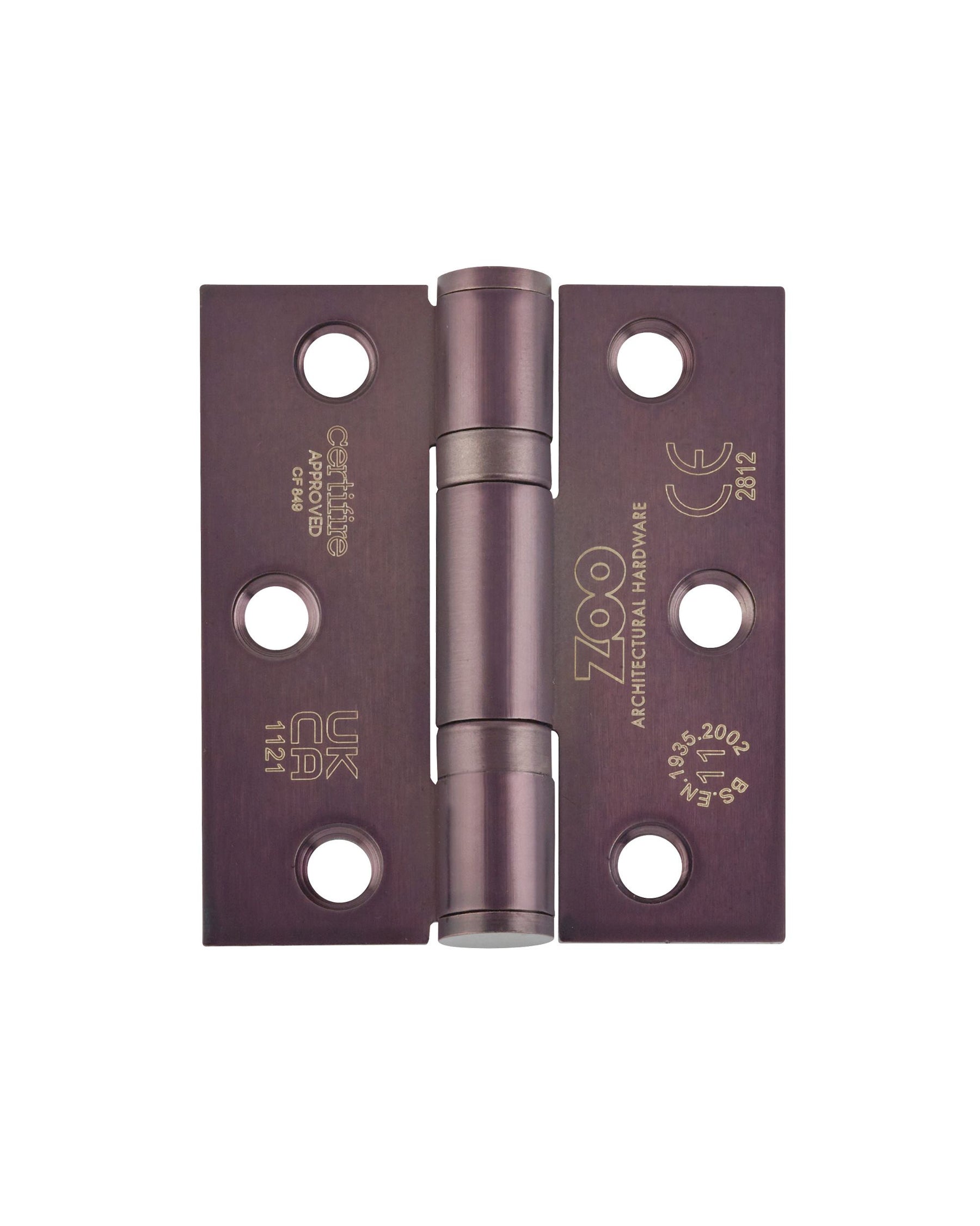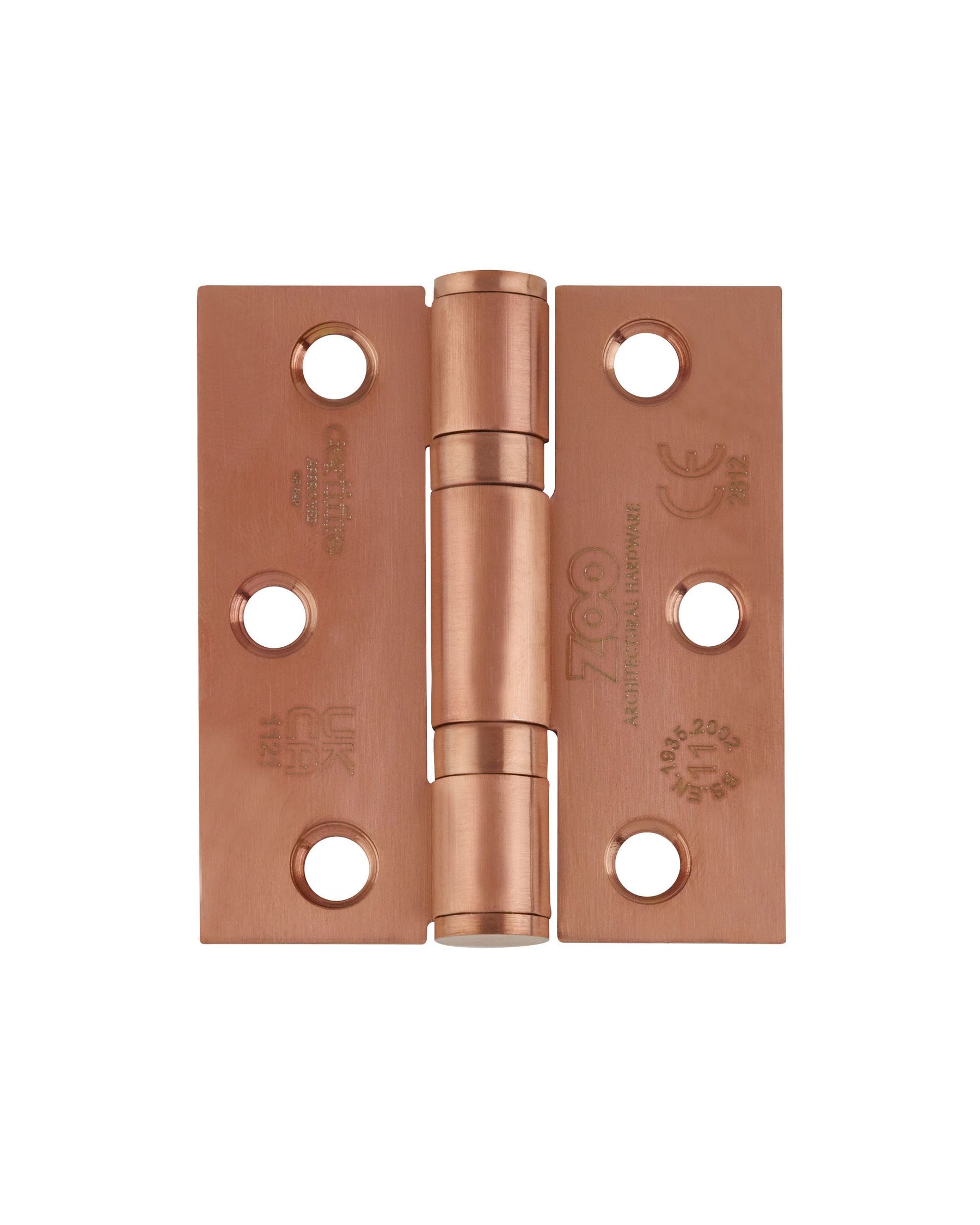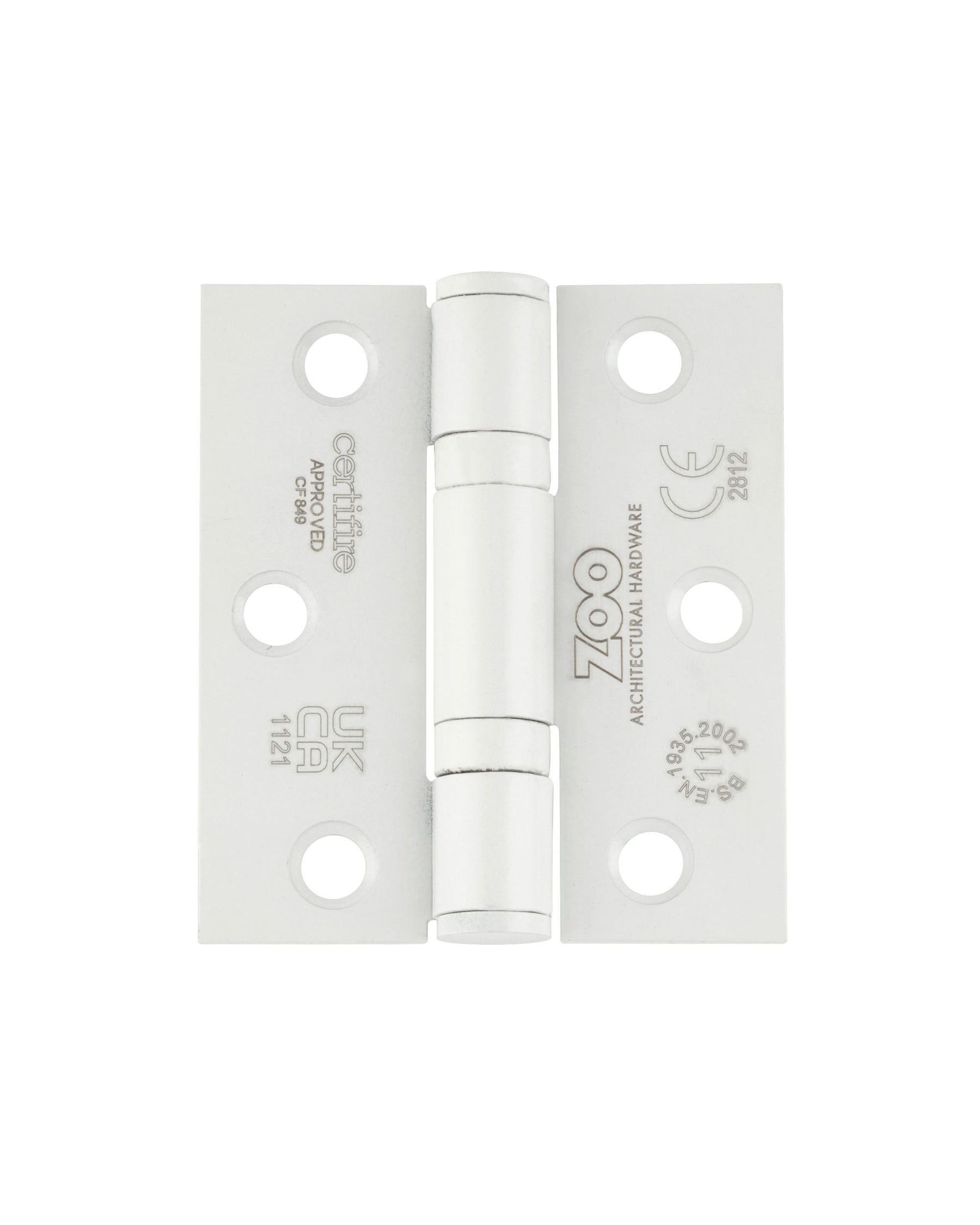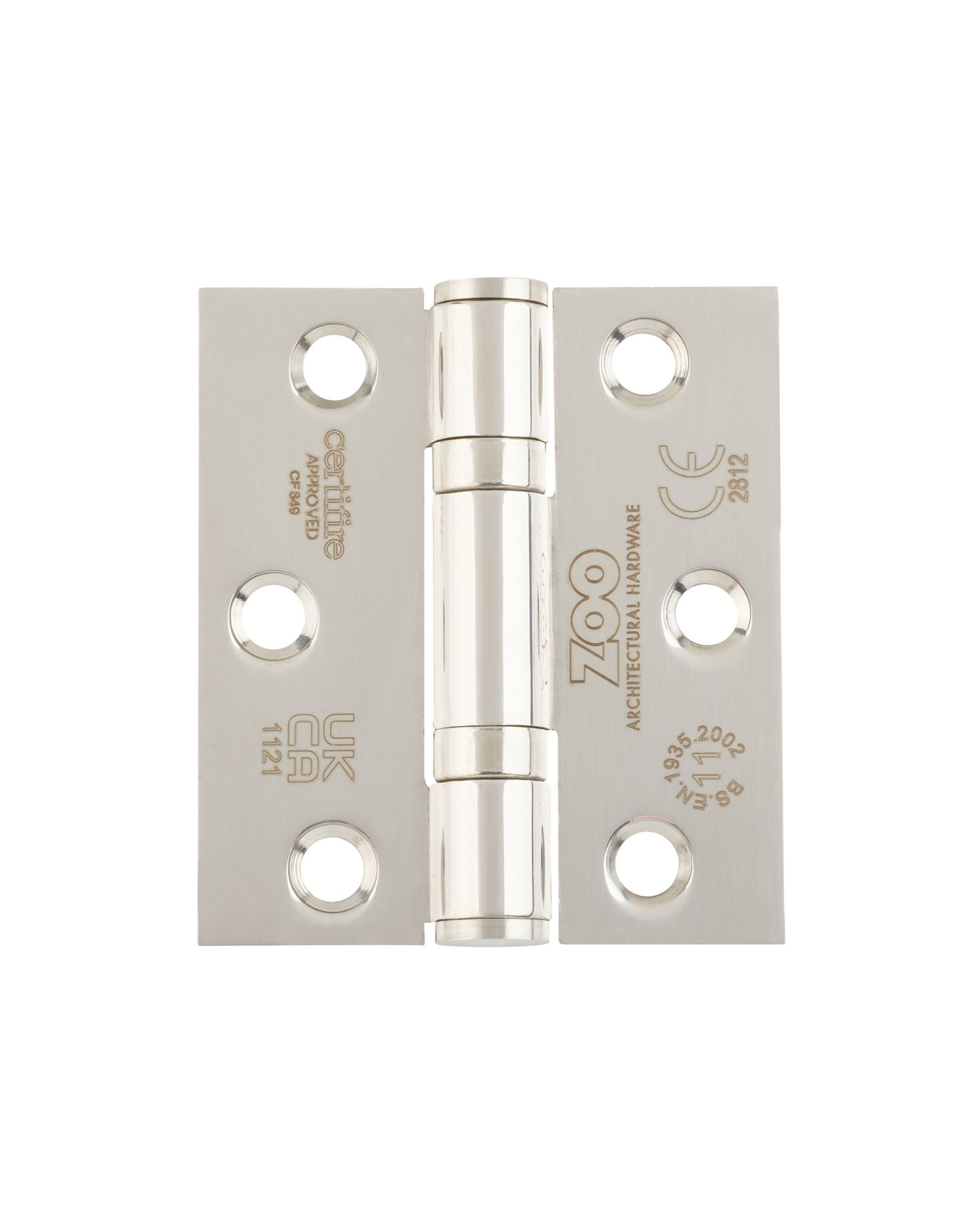 A pair (set of two) Grade 11 ball bearing hinges with square corners to suit maximum door weight 80kgs per pair, tested and conforming to BSEN 1935:2002, CE Marked, CERTIFIRE approved, supplied with screws.
